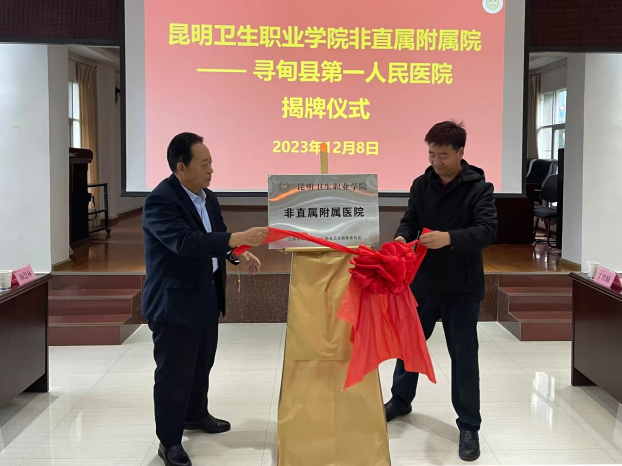 2023年12月8日上午,浦京在寻甸县第一人民医院,举行了350vip浦京集团官网非直属附属医院的授牌仪式。寻甸县卫生健康局副局长、县中医药管理局局长周顺云,云南泓旻教育投资集团董事长、350vip浦京集团官网理事长龙正昌,寻甸县人民医院党委书记周亚菲、党委副书记李国俊、副院长唐光勇、副院长马德付、副院长杨绍坤,350vip浦京集团官网副院长张尤松副教授、临床学院院长张群智教授、护理学院院长蒋淑昆教授、教务处处长孟州令、实习处副处长颜慧林等领导出席授牌仪式,学院及医院相关处室、科室干部参加了仪式。授牌仪式由寻甸县第一人民医院副院长唐光勇主持。