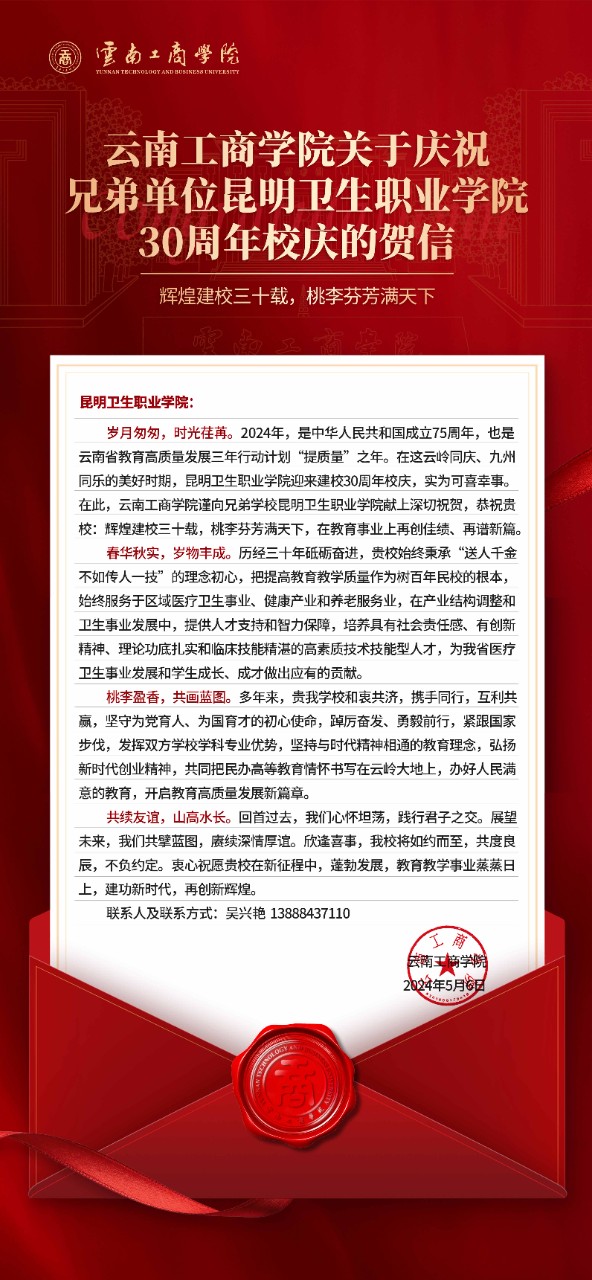 云南工商学院致350vip浦京集团官网建校30周年庆典贺信