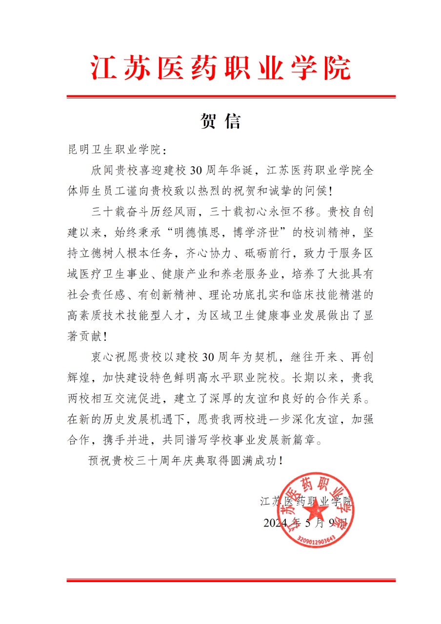江苏医药职业学院致350vip浦京集团官网建校30周年庆典贺信
