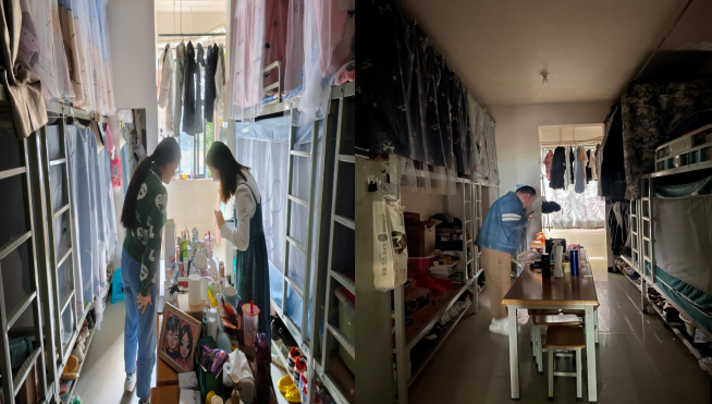 为营造一个安全、整洁、和谐的宿舍环境,推动文明宿舍建设,让学生有一个良好的住宿氛围,在大学生工作部领导下,中医学院学管系列组织中医学院学管办及全体辅导员,于2024年10月17日开展了全面的宿舍安全检查,本次检查过程中存在的问题有地面不干净、衣物摆放杂乱以及部分学生离开宿舍后窗户紧闭,通风不畅等问题,要求相关宿舍进行整改,经与辅导员、宿管进行反映和沟通,共同督促学生认真整改宿舍,并提醒学生合理安排时间,养成良好的生活习惯,做好个人卫生和宿舍清洁工作,定期加强宿舍卫生、宿舍安全相关的宣传教育,提高学生的卫生意识、安全意识,使宿舍卫生安全教育潜移默化。此次安全大检查,旨在加强学生安全意识,规范宿舍管理,及时发现并消除安全隐患,中医学院学管系列将继续加强宿舍卫生安全检查工作,将安全卫生状况落实到位。