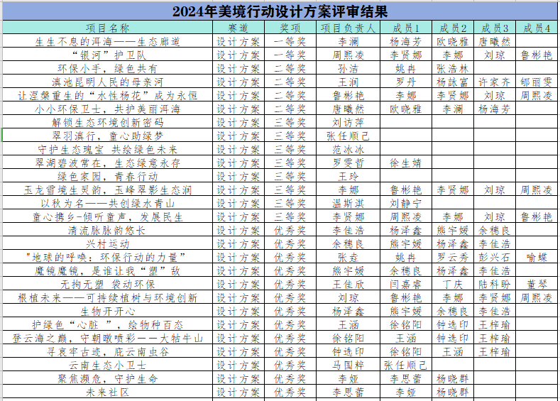当环保的号角与青春的创意激情碰撞,当科学的智慧与艺术的灵感深度交融,一场属于新时代大学生的绿色革命正在云岭大地蓬勃展开。2024年度校级“美境行动”生态环境创新校赛圆满收官,浦京的青年才俊以智慧为笔、以行动为墨,在“绿水青山就是金山银山”的画卷上留下了浓墨重彩的一笔。经评审专家严格评审,现将实施报告与设计方案的获奖名单予以公示,让我们共同见证这份属于青春的绿色荣光!