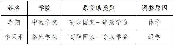 高职国家助学金:经二级学院核实受助学生名单,结合全国学生资助系统更新的重点保障人群数据,经学生申请,二级学院审核,学籍科、资助中心核实确认,现共计2名受助学生因学籍变动不再符合高职国家助学金受助条件。现将受助资格收回,重新分配至其他2名符合资助条件且家庭经济困难的学生。