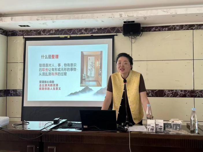 在每个方面的讲解中,牟老师都融入了独特的见解与实用的方法。对于“你的空间在说什么”,她引导师生们去观察和解读空间所传达的信息,如杂乱的桌面可能暗示着内心的无序,从而鼓励大家从空间的反馈中去审视自己的生活状态。“小空间高效整理术”则聚焦于实际操作技巧,通过分享利用各种收纳工具和巧妙布局,让即使狭小的空间也能发挥出最大的效用。在阐述“空间管理=时间管理”时,她指出整洁有序的空间能减少寻找物品时的时间浪费,提高生活和学习效率,同合理安排时间一样重要。