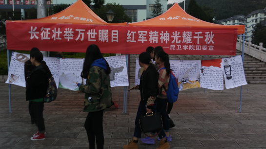 此次活动内容丰富,形式多样,范围广,有“看照片讲故事”、“征文”、“演讲朗诵”等,覆盖面到全院所有师生。启动日当天下午,校团委宣传部提前准备了十个红军长征小故事,并附上图片,将它们贴至学校大屏幕下展出,供同学们进行参观了解,激发大家参与活动的兴趣。虽然活动当天小雨纷纷,但还是有许多同学停留认真观看,生动形象的海报让同学们知道现如今的幸福生活来之不易,即使在这种和平年代也不能忘记红军战士们的艰辛抗战,这些都是他们用自己的献血铺出来的胜利的道路!