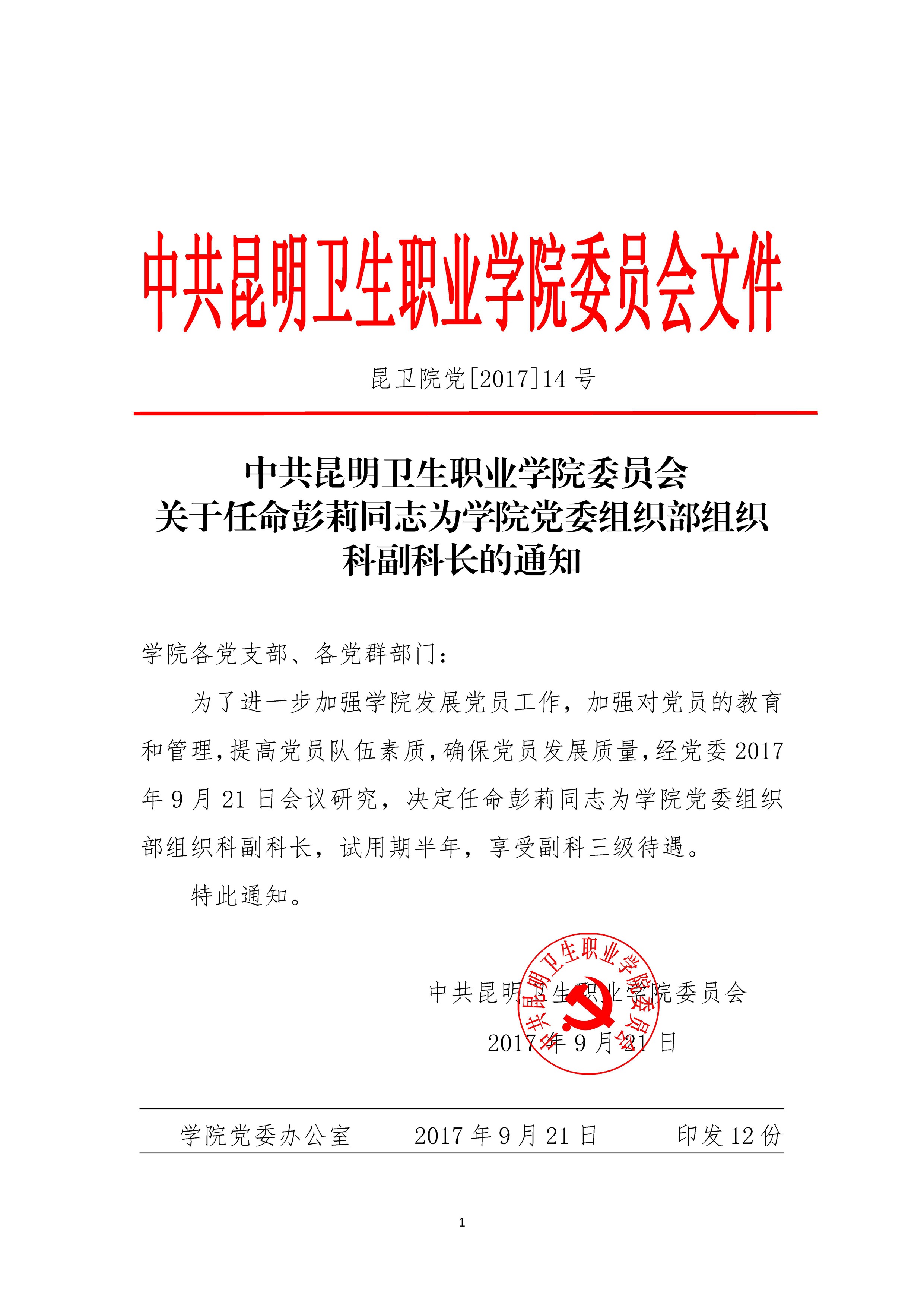 关于彭莉同志任命的通知