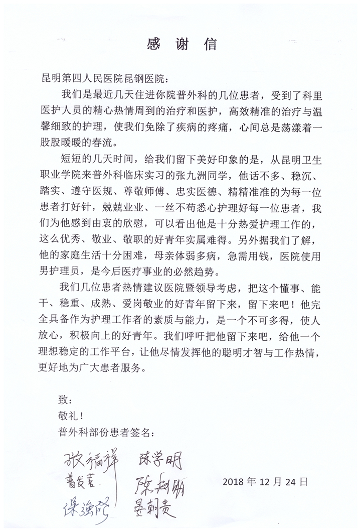 导语:医学也是人文科学,医生有了温度,医学也就彰显了温暖之本色。浦京护理专业张九洲同学在昆明市第四人民医院(昆钢医院)普外科因其实习工作突出,收到病人联名书写的感谢信和推荐信,他为学院实习生树立了良好的医者仁心的形象,展现了浦京学子扎实的医学技能和优良服务意识的风采。希望全院实习生向他学习,学习他树立服务意识、一切为了病人的服务理念,学习他甘于奉献、关爱病人的良好作风,以实际行动践行医学生誓言,为弘扬社会主义核心价值观献出自己的一份力量!