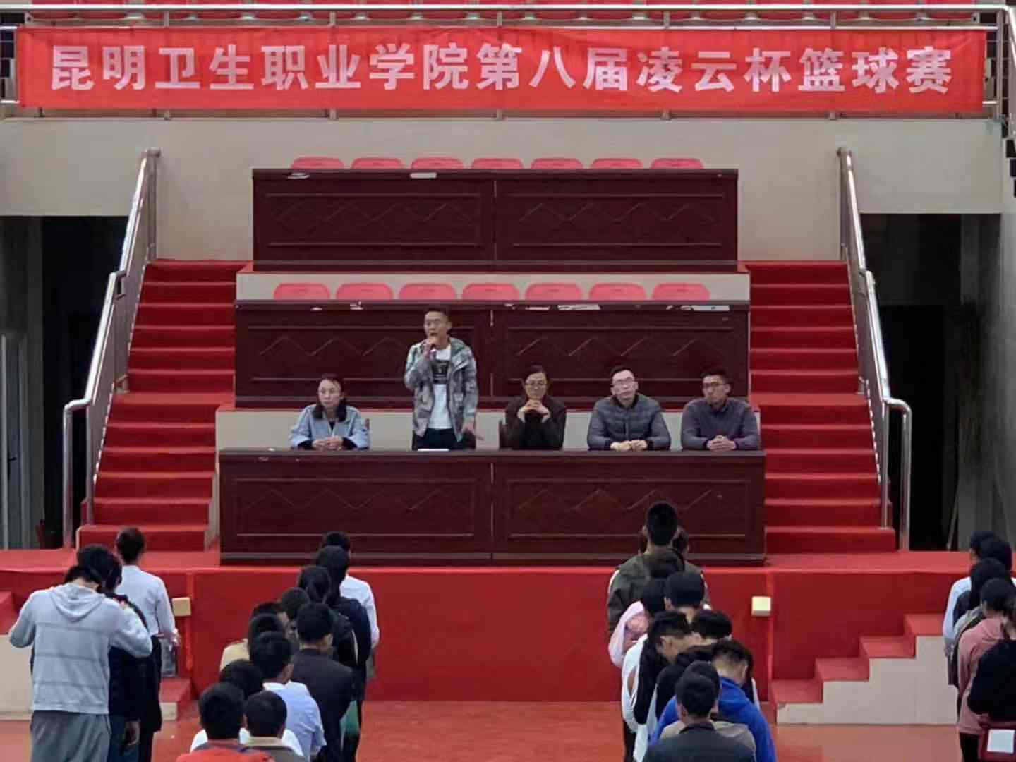 大学生工作部副部长施兴乐老师为开幕式致辞。施老师指出,篮球赛不仅能丰富校园文化生活,还能激励师生积极参加体育锻炼,强健体魄,促进师生身心健康成长,也是全面推进素质教育的一项重要举措。并要求运动员在篮球赛期间服从裁判决定,认真比赛;要求裁判公正判罚,认真执裁。随后,参赛员代表和裁判员代表分别宣誓。最后,裁判组组长朱泓宇老师宣布第八届“凌云杯”篮球赛顺利开幕。