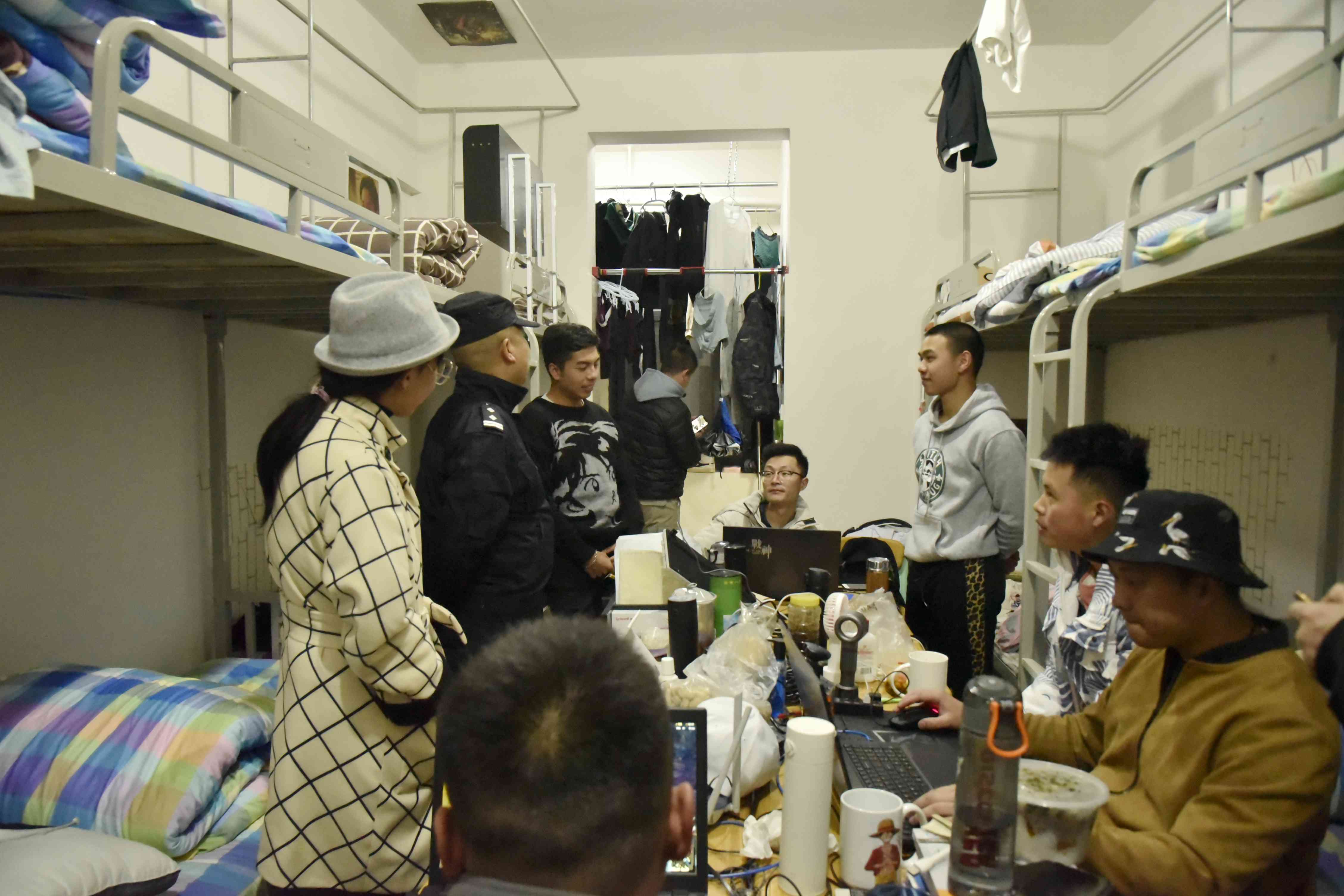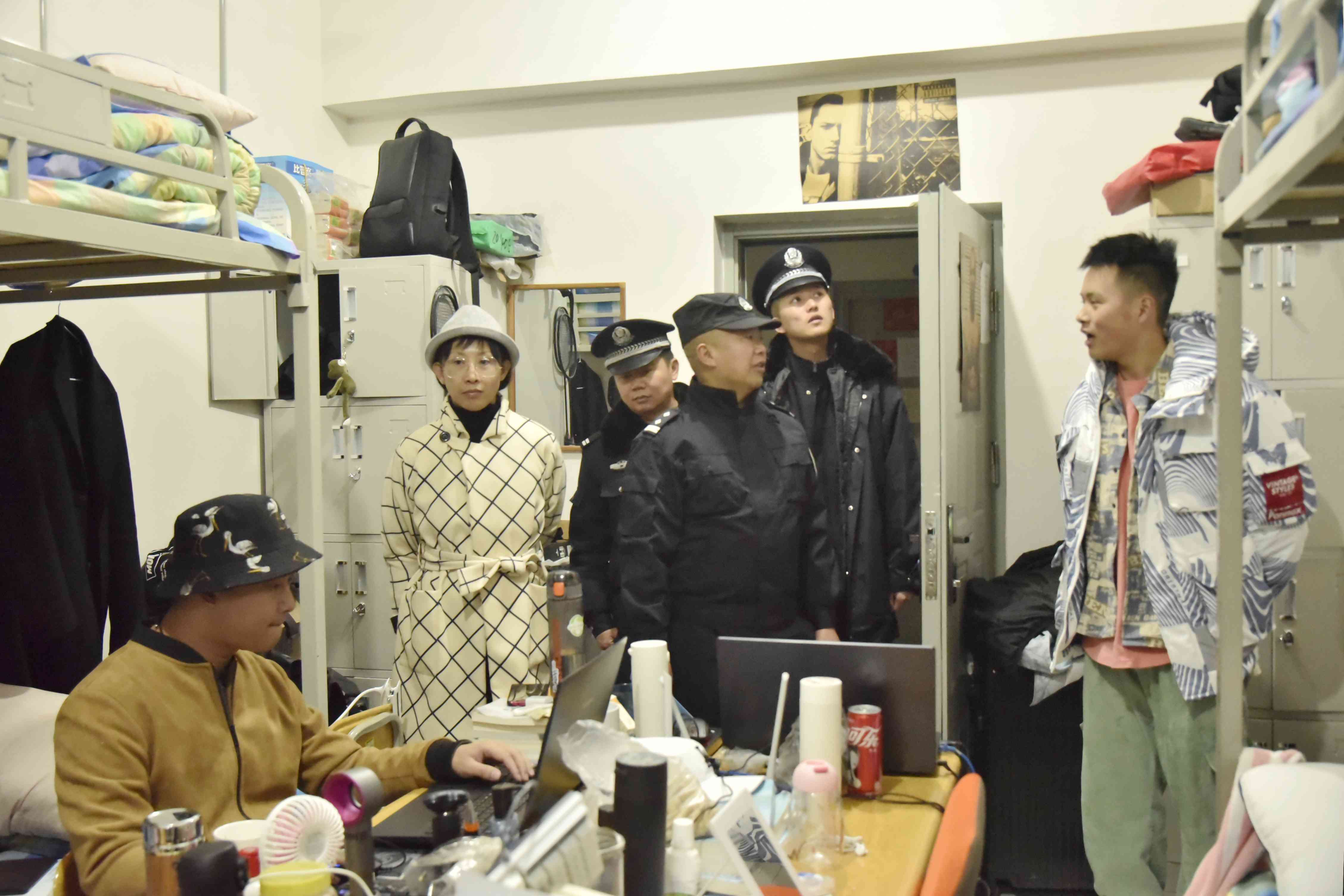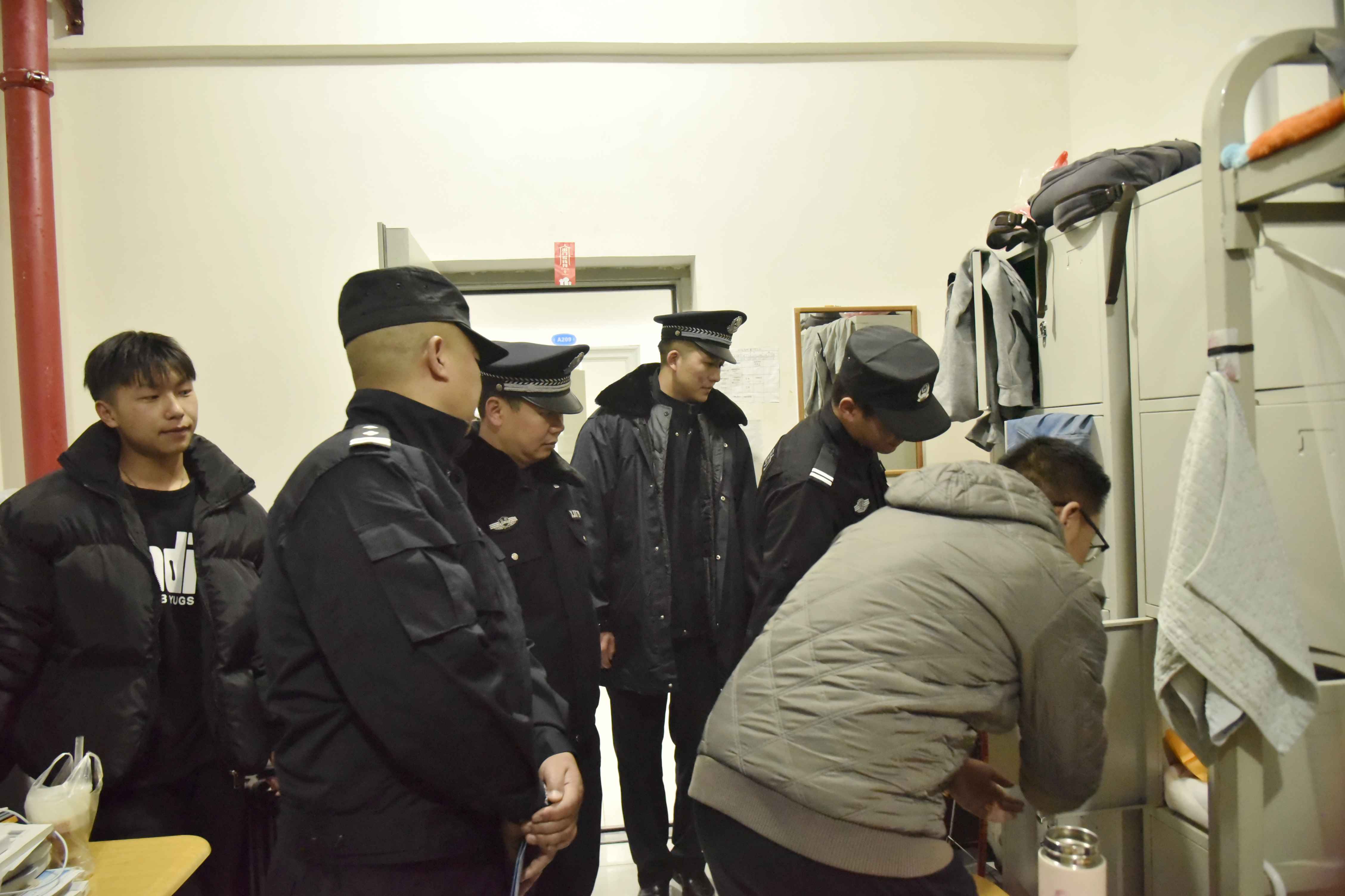 为进一步营造平安、整洁、文明的宿舍环境,贯彻落实省委教育工委和学院安全稳定相关会议精神,2019年12月8日晚,学院开展了一次宿舍安全卫生专项检查活动。本次安全大检查得到辖区派出所的大力支持,昆阳派出所赵警官等4名警官参与了此次行动。
