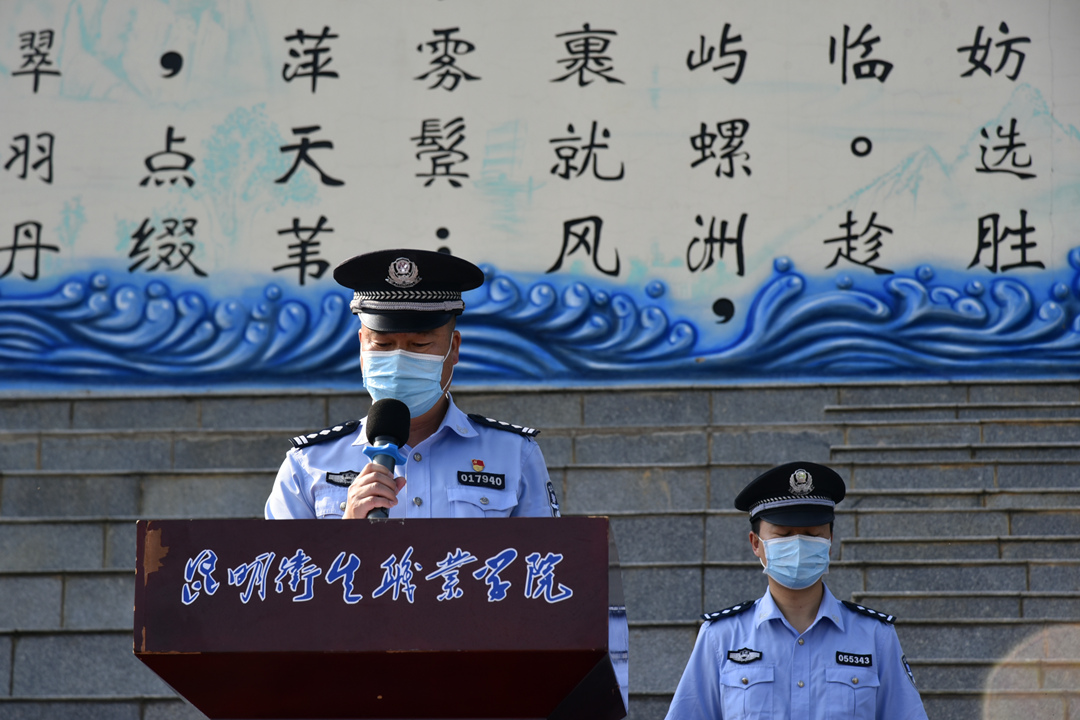 昆明市公安局党委委员、指挥中心主任李文吉为350vip浦京集团官网志愿者服务队授队旗。