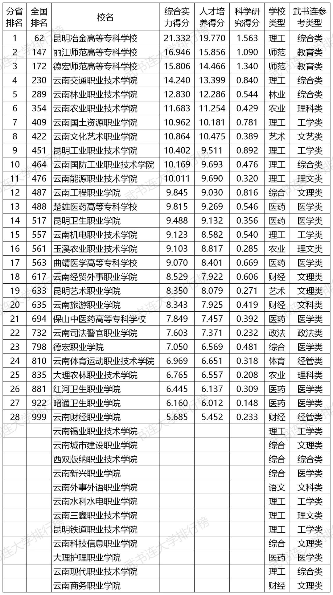 武书连2020云南省高职高专综合实力排行榜