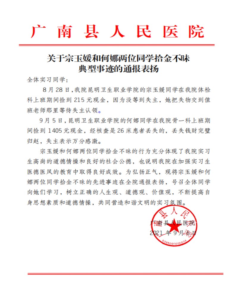 广南县人民医院对浦京宗玉媛和何娜两位实习生拾金不昧的典型事迹进行了全院通报表扬