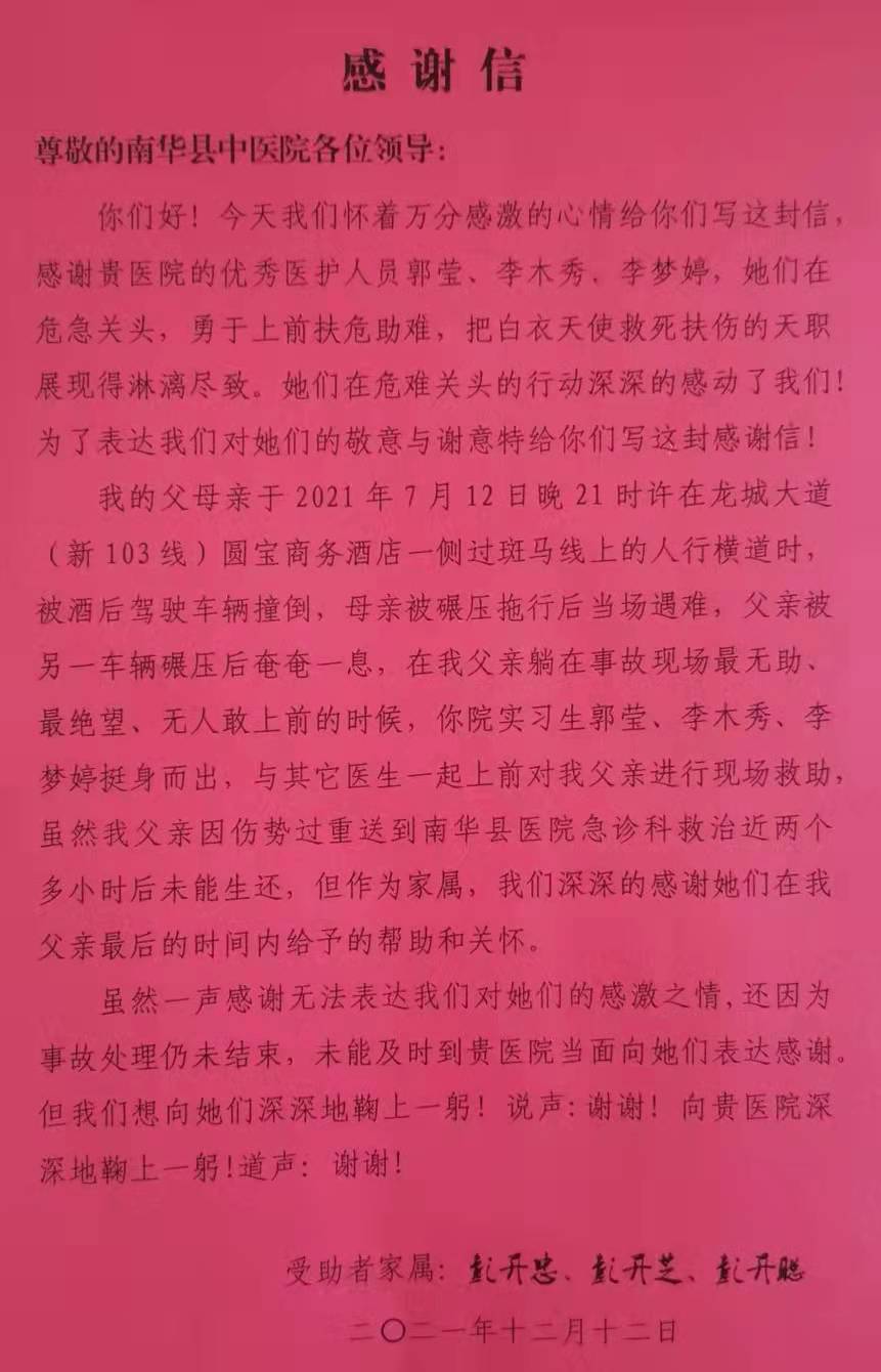 12月14日上午,一名男子到南华县中医医院,向浦京在医院实习的三名实习生深深地鞠了一躬,表示诚恳的谢意,并向医院党委递上感谢信,感谢她们在危难关头,及时伸出援手救助遭遇车祸的父亲。