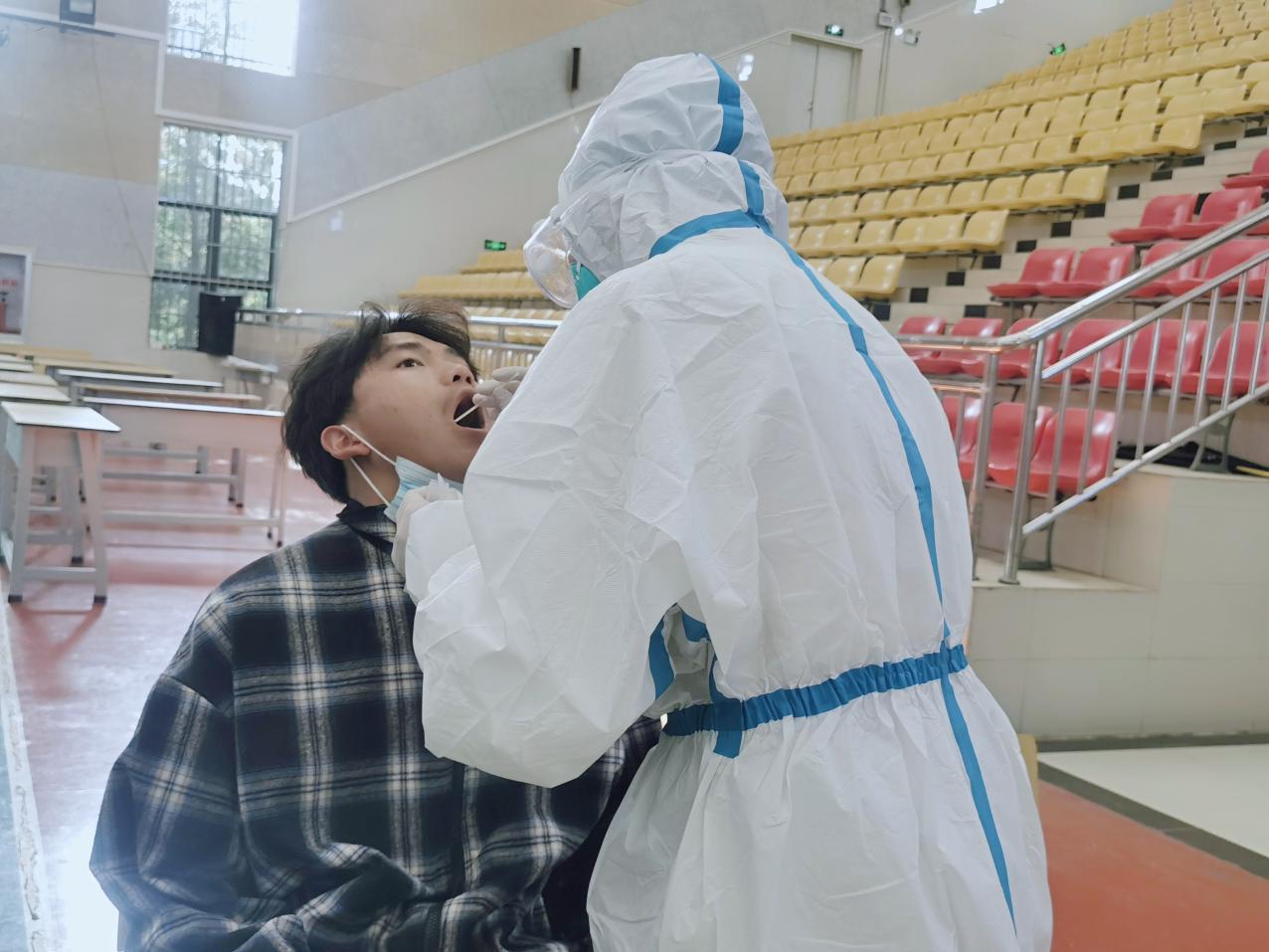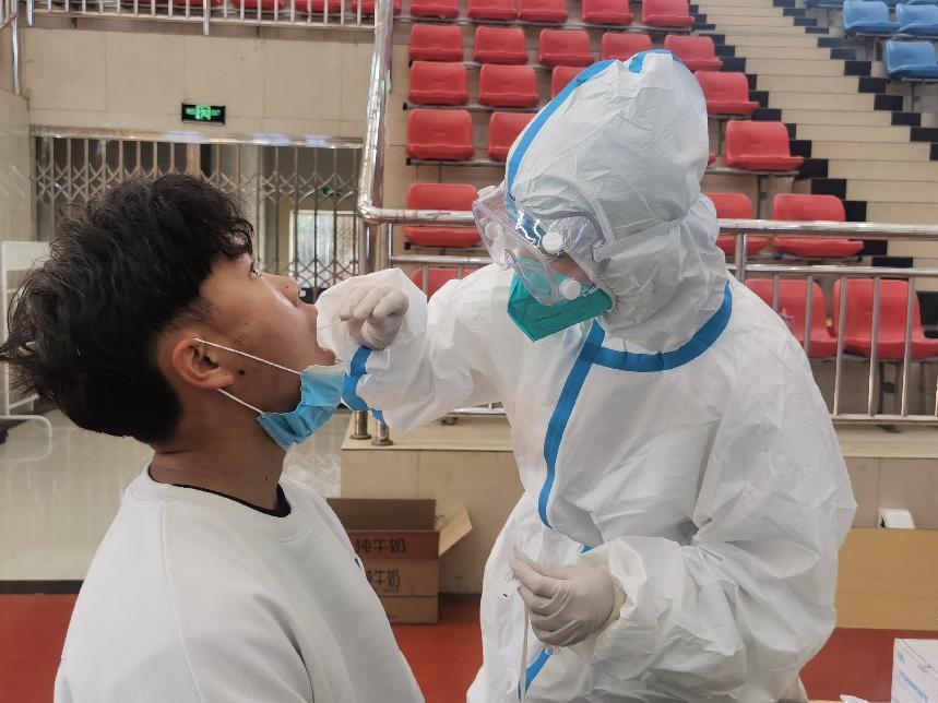 检测现场,各部门教职工、学生在现场工作人员的引导下,严格按照疫情防控要求,保持一米安全线,有序排队、出示采样码、登记、检测等工作。医护人员在做好相应防护措施的前提下,规范操作,为教职工和学生采集核酸样本,秩序井然有序,采集工作有条不紊。