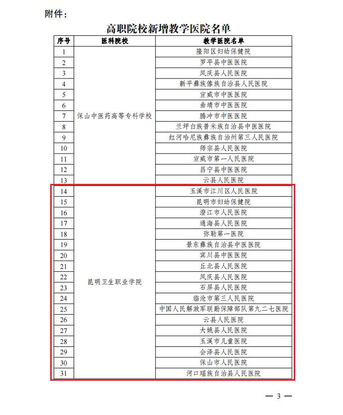 4月24日,云南省教育厅、云南省卫生健康委员会发布了《关于公布高职院校新增教学医院名单的通知》,经高职院校和医院自主申报,省教育厅、省卫生健康委专家审定,本次浦京获批设立的教学医院共有29所。