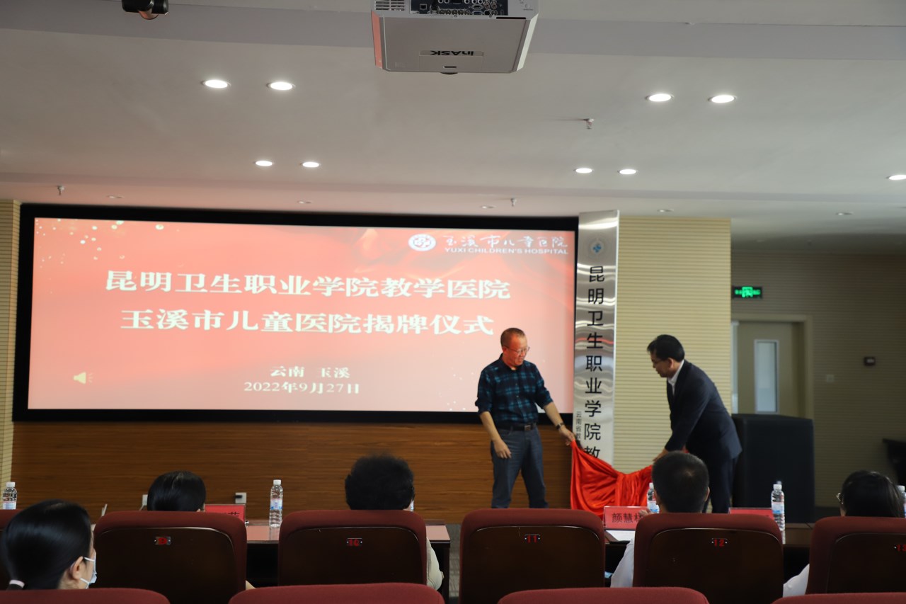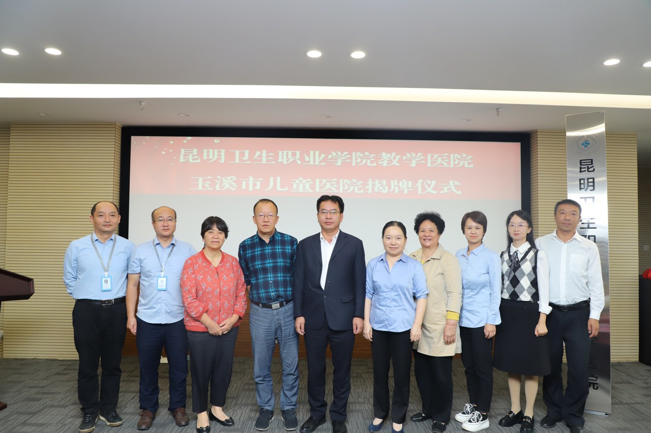 9月27日,350vip浦京集团官网与玉溪市儿童医院举行了教学医院揭牌仪式。玉溪市儿童医院党委书记杨丽萍,玉溪市儿童医院党委副书记、执行院长李超,玉溪市儿童医院党委副书记陈荣,玉溪市儿童医院副院长杨晓云、陈文娟、杨杰,350vip浦京集团官网副院长张尤松,护理学院院长蒋淑昆,检验学院院长张群智,实习管理处副处长颜慧林,实习管理科黄如楷老师,以及医院各教研室(组)主任、秘书,实习生出席了揭牌仪式。