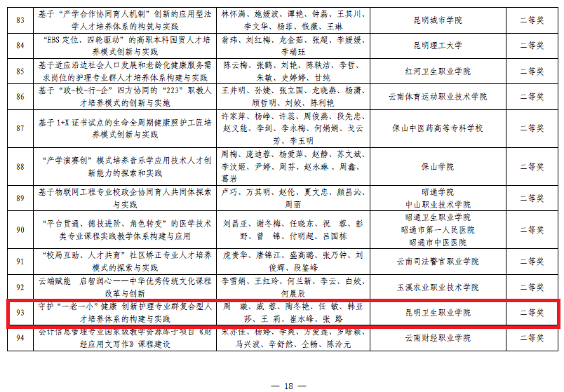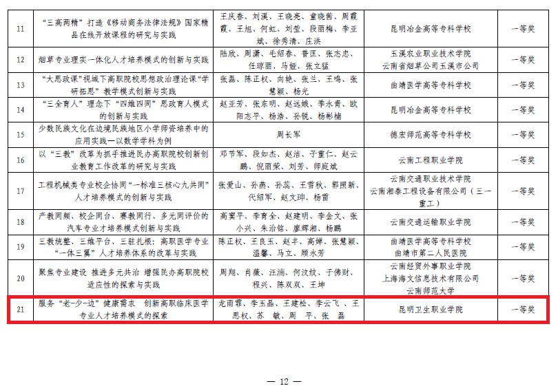 近日,云南省教育厅、云南省人力资源和社会保障厅发布了关于表彰云南省教学成果奖的决定(教发〔2023〕13号)的通知,经过单位申报、专家评审、网上公示和云南省教学成果奖评选表彰领导小组审定,浦京龙雨霏、李玉晶、王建松、李云飞、王思权、苏敏、周平、张磊团队的“服务‘老-少-边’健康需求创新高职临床医学专业人才培养模式的探索”荣获一等奖(职业教育类);周璇、戚蓉、陶冬艳、任敏、韩亚莎、王莉、崔水峰、张路团队的“守护‘一老一小’健康创新护理专业群复合型人才培养体系的构建与实践”荣获二等奖(职业教育类)。