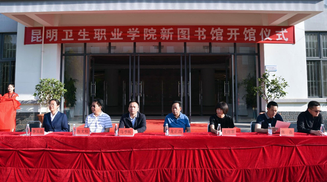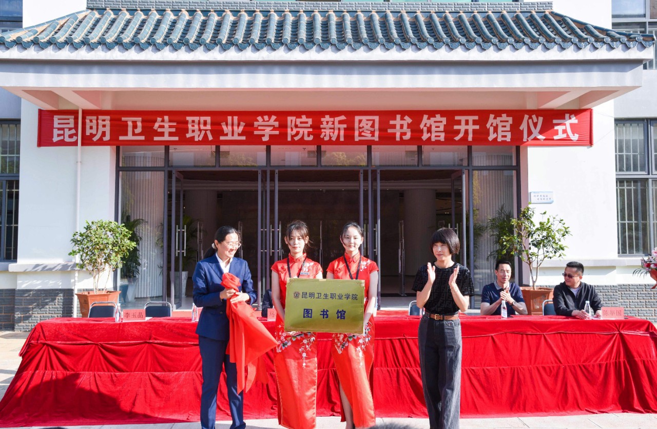 在喜庆的鞭炮声中,龙雨霏院长和李玉晶副院长共同掀起红绸,为新图书馆开馆揭牌。