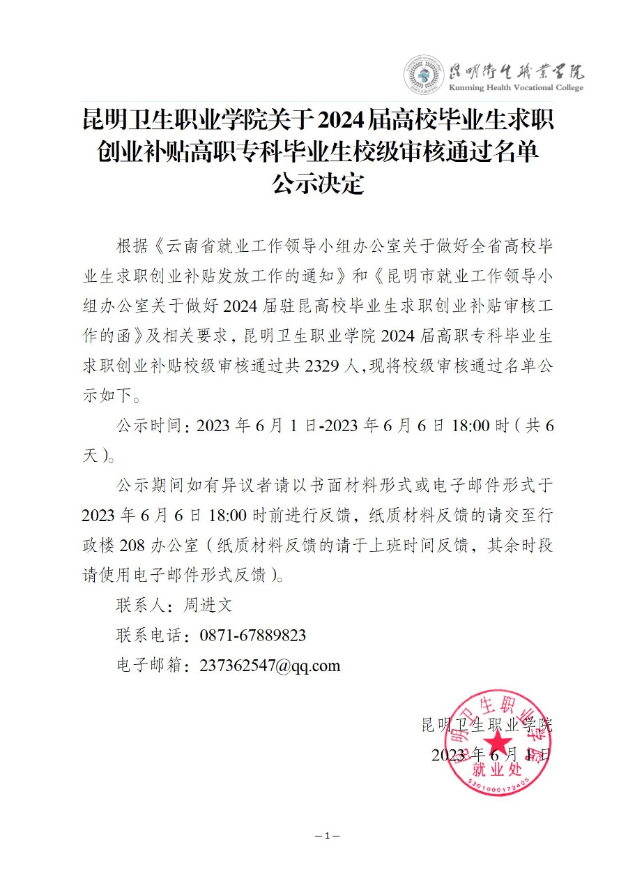 350vip浦京集团官网关于2024届高校毕业生求职创业补贴高职专科毕业生校级审核通过名单公示决定