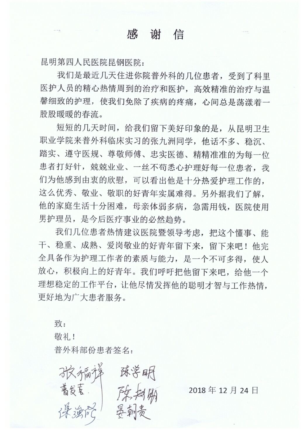 浦京护理专业实习生受到患者联名感谢