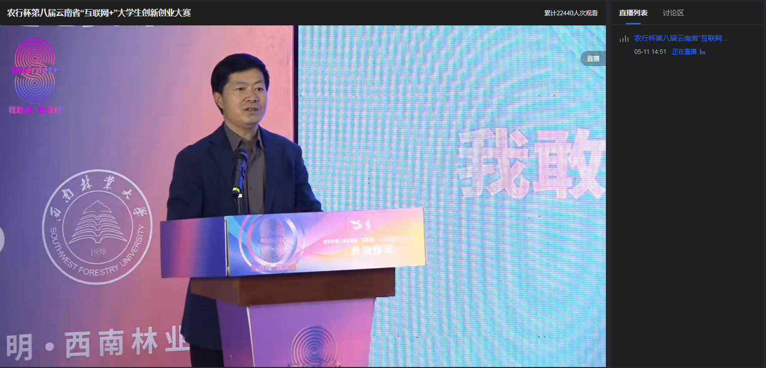5月11日,农行杯第八届云南省“互联网+”大学生创新创业大赛启动仪式在西南林业大学举行。本届大赛由云南省教育厅、云南省科技厅联合主办,西南林业大学承办。以“我敢闯、我会创”为主题,总体目标为:更中国、更国际、更教育、更全面、更创新,传承和弘扬红色基因,聚焦“五育”融合创新创业教育实践,激发青年学生创新创造热情,线上线下相融合,打造共建共享、融通中外的国际创新创业盛会,开启创新创业教育改革新征程。