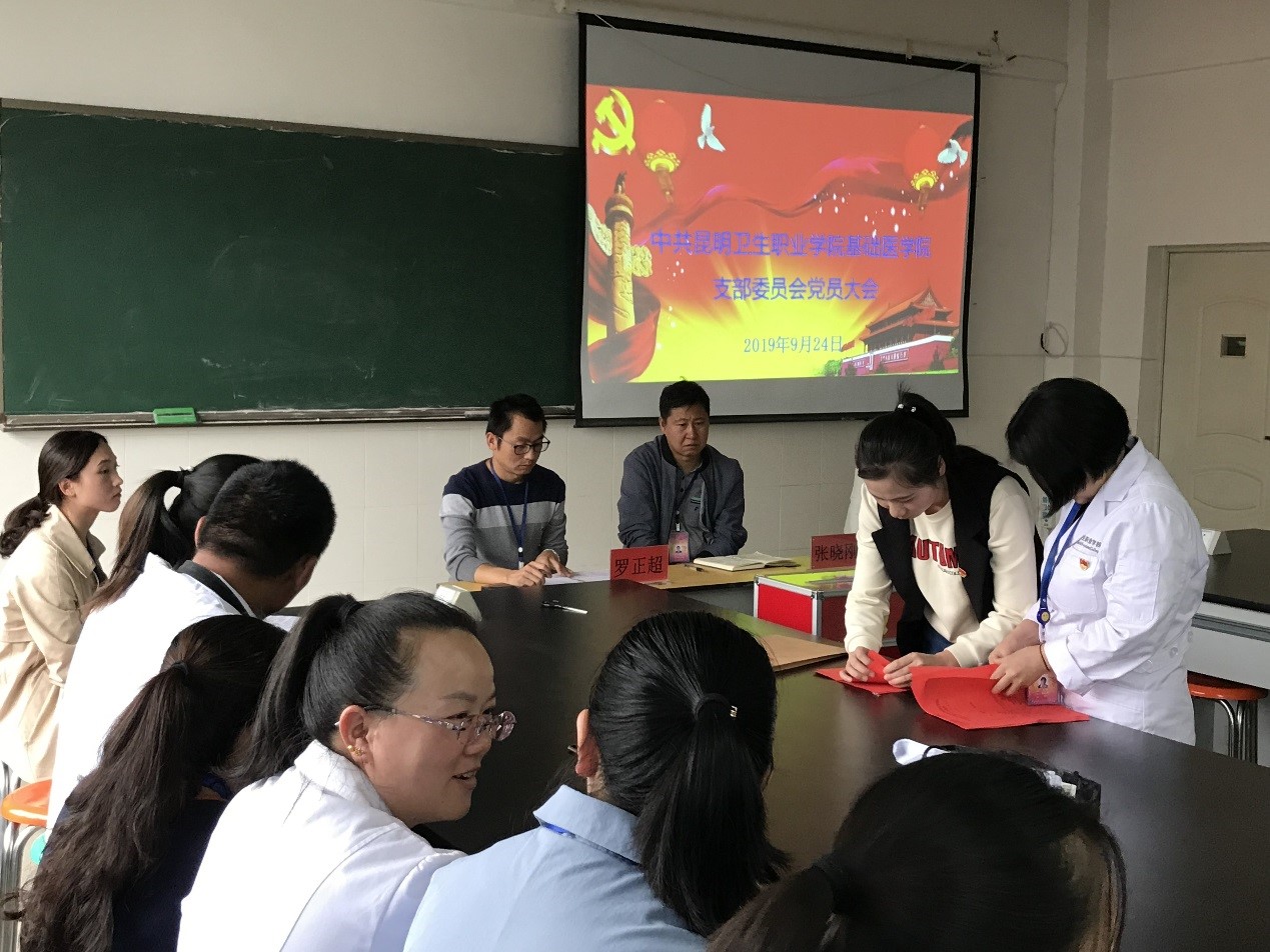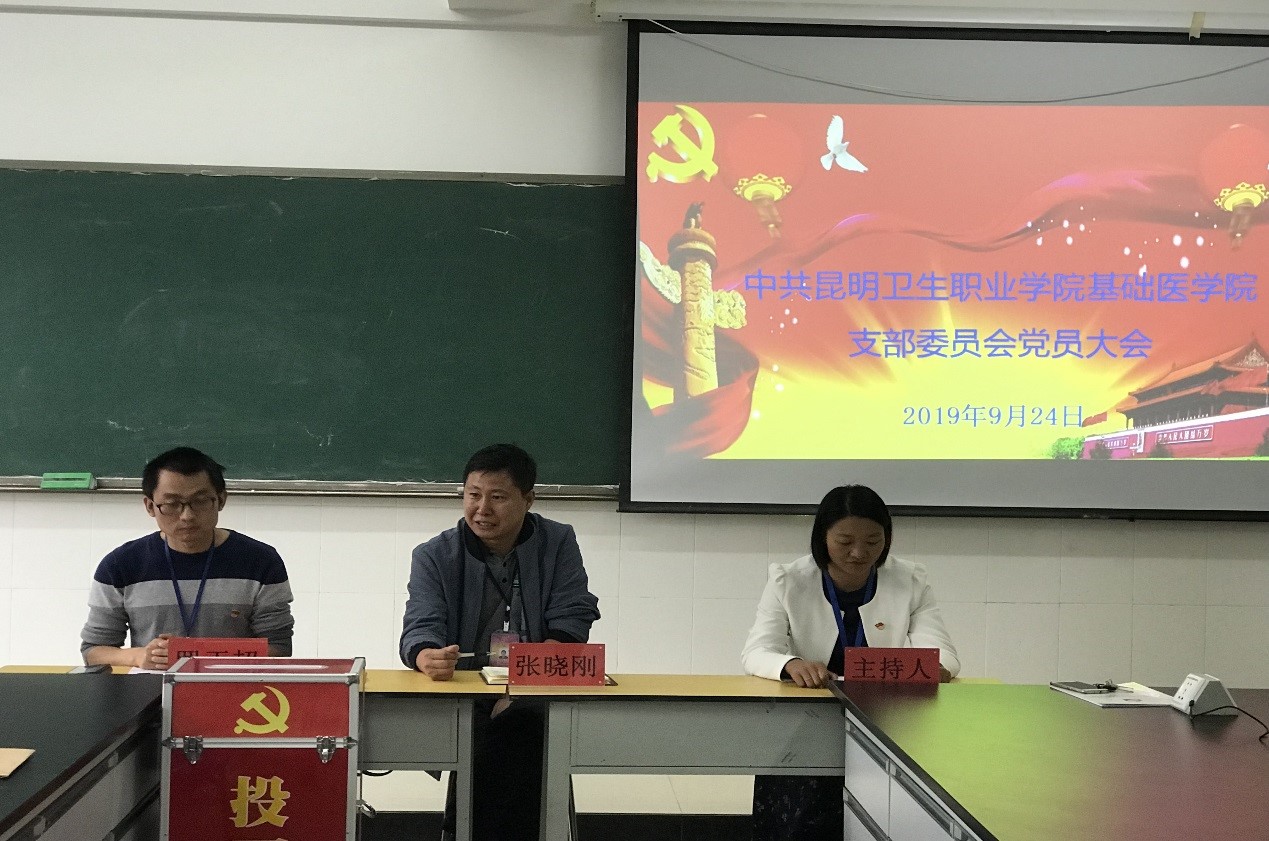 因党员队伍不断壮大,基础医学院党支部于2019年6月19日经党委批准成立,将原临床学院党支部的基础医学院党员教师划分到基础医学院党支部,并于2019年8月15日任命基础医学院副院长罗正超同志为党支部书记。2019年9月24日下午,基础医学院党支部召开党员大会选举支部委员会委员,会议由原临床学院党支部组织委员陆桂花同志主持,基础医学院党支部党员共29人参加了会议,入党积极分子和发展对象10余人观摩了本次党员大会,学院党委副书记张晓刚也出席了本次会议。