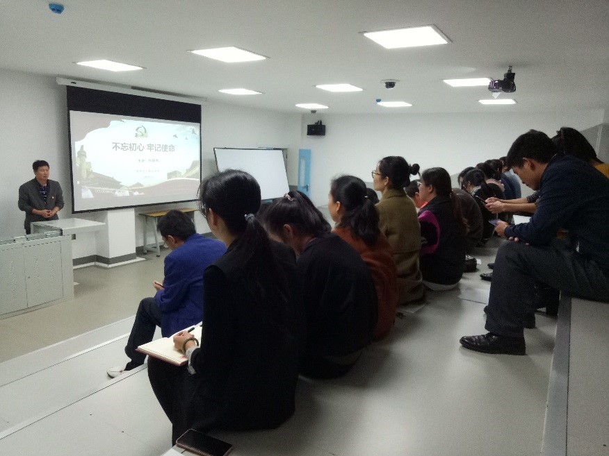 张晓刚副书记主要从四个方面讲解:中国共产党的初心与使命;“初心与使命”的主题教育;主题教育的担当与方向;牢固树立四个意识做合格党员。张晓刚同志结合教育工作的实际及教师与学生的关系,围绕“不忘初心、牢记使命”的主题,勉励大家坚定信念,奋发图强,将学院的教育教学工作做实。党员初心使命,教育引导广大党员常怀感恩之心,坚决拥护中国共产党的领导,始终把知恩图报当作一种优秀的品德,始终把党装在心中,真正以党的最新理论和最新思想来武装自己,牢固树立“四个意识”,始终坚定“四个自信”,切实做到“两个维护”,坚决履行党员义务,发挥党员的先锋模范作用。