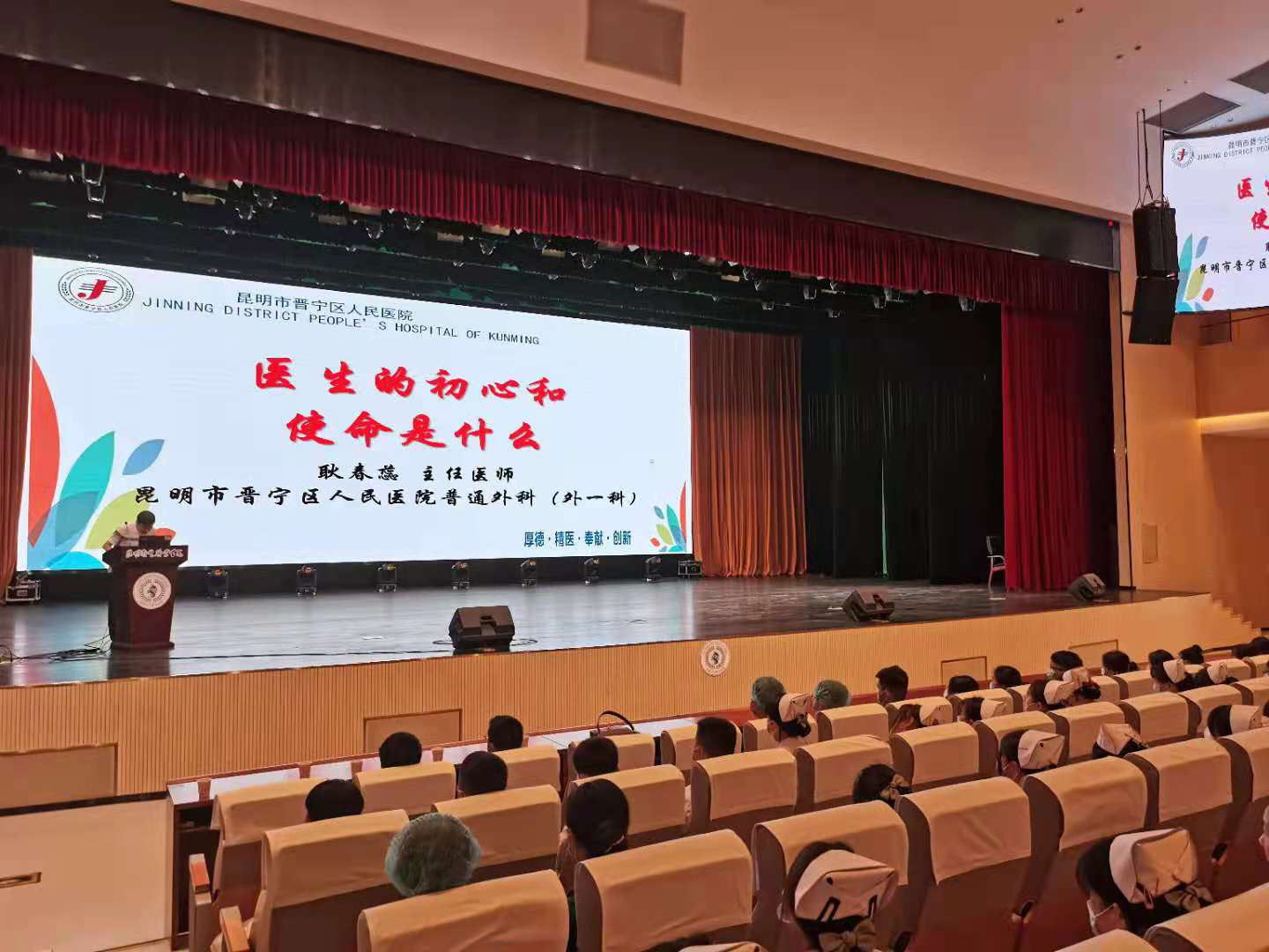 根据晋宁区委党史学习领导小组办公室《关于在当时学习教育中广泛开展“永远跟党走·奋进新征程”百姓宣讲活动的通知》文件精神,350vip浦京集团官网在2021年职业教育活动周之际,邀请了昆明市优秀科技工作者、第六批昆明市中青年学术和技术后备人选、昆明市劳动模范、昆明市有突出贡献优秀专业技术人员、云南模范优秀医师、“和谐晋宁优秀专业技术人才”——耿春蕊同志,开展了主题为“医生的初心和使命”的大型宣讲会。