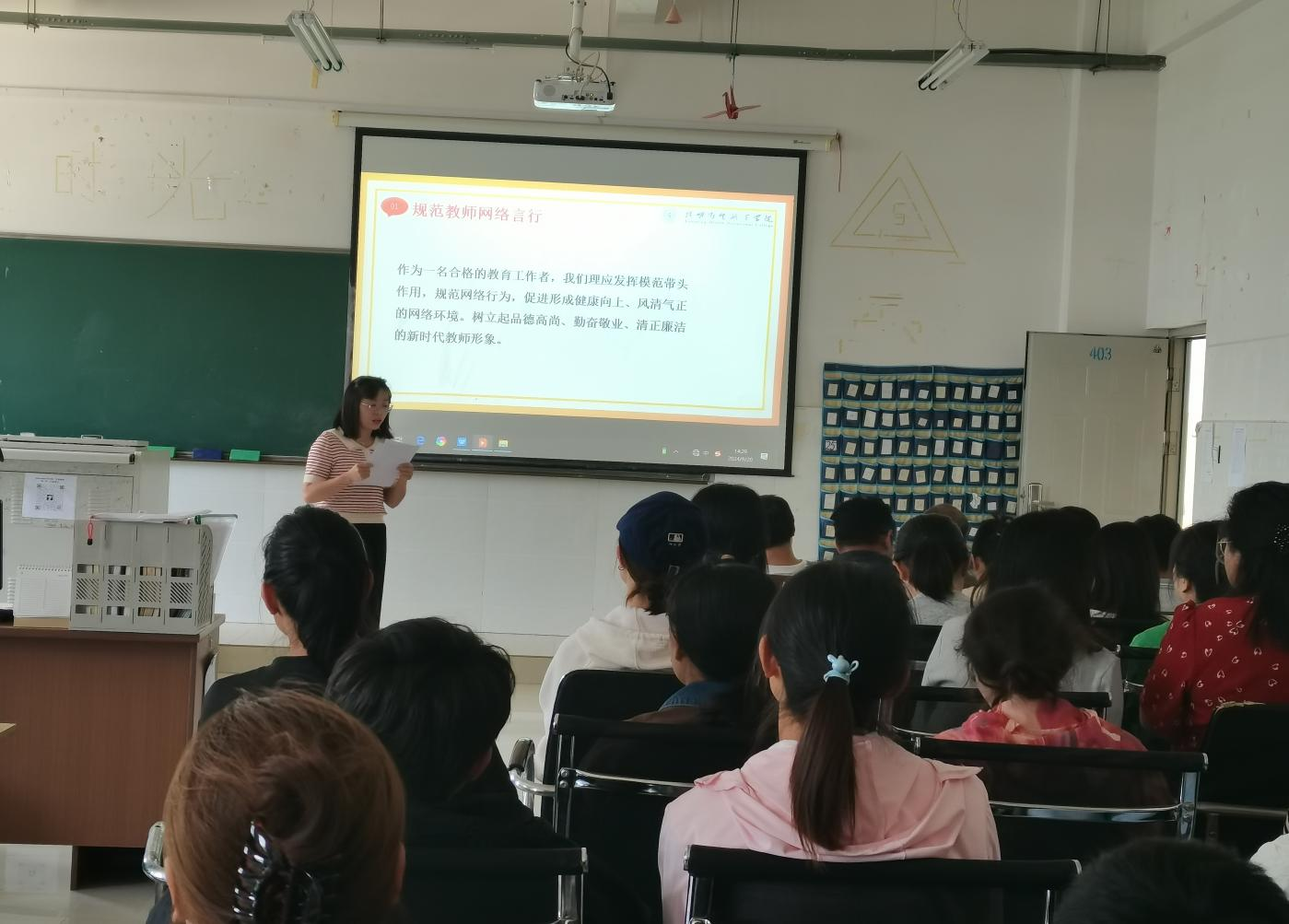 会上,杨丽琴重温领学《新时代高校教师职业行为十项准则》、 《中共350vip浦京集团官网委员会关于印发教职工违反职业道德行为处理办法(试行)的通知》以及《第四批违反教师职业行为十项准则及违纪违法典型案例》等文件。强化广大教师对职业行为规范的了解,引导广大教师潜心教学,努力成为有理想信念、有道德情操、有扎实学识、有仁爱之心的“四有”好老师。同时通过一个个师德失范典型案例的学习,要求教师们进一步认识到师德师风是教师职业的生命线,必须时刻坚守,不容有丝毫懈怠。