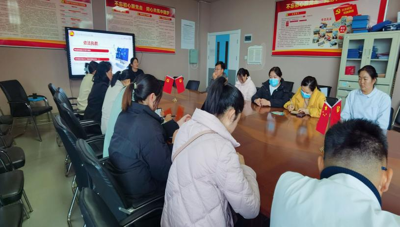 首先,第一党支部书记蒋晓羽带领全体党员学习了第一议题的相关内容,认真学习习近平总书记二〇二四年新年贺词精神,引导广大党员回顾一年来党和国家事业取得的辉煌成就,进一步坚定信心、鼓足干劲、奋发进取、真抓实干,以更加饱满的精神状态奋进新征程建功新时代。随后,党员们一同观看了教育法律法规的相关视频,初步了解相关教育法规及教育政策,明确教师的教育职责。蒋晓羽书记结合具体的贴近实际的典型案例,给老师们详细解读了《中华人民共和国教育法》《中华人民共和国教师法》《国家中长期教育改革和发展规划纲要》以及新《未成年人保护法》等教育法律法规,进一步规范了教职工的职业行为,引导大家争做有理想信念、有道德情操、有扎实学识、有仁爱之心的“四有”好教师。