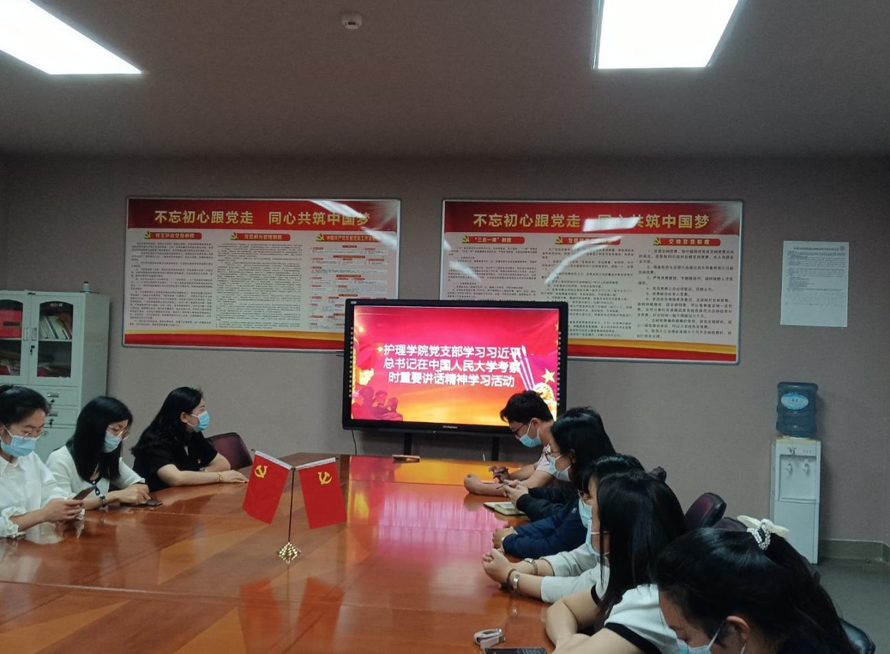 五四青年节前夕,习近平总书记来到中国人民大学考察,深情寄语广大青年。护理学院党支部积极组织全体党员同志、开展学习习近平总书记在中国人民大学考察时重要讲话精神学习活动,将迎接和学习宣传贯彻党的二十大、认真学习宣传贯彻习近平总书记在中国人民大学考察时的重要讲话精神作为重要政治任务,并贯穿于主题教育活动全过程。