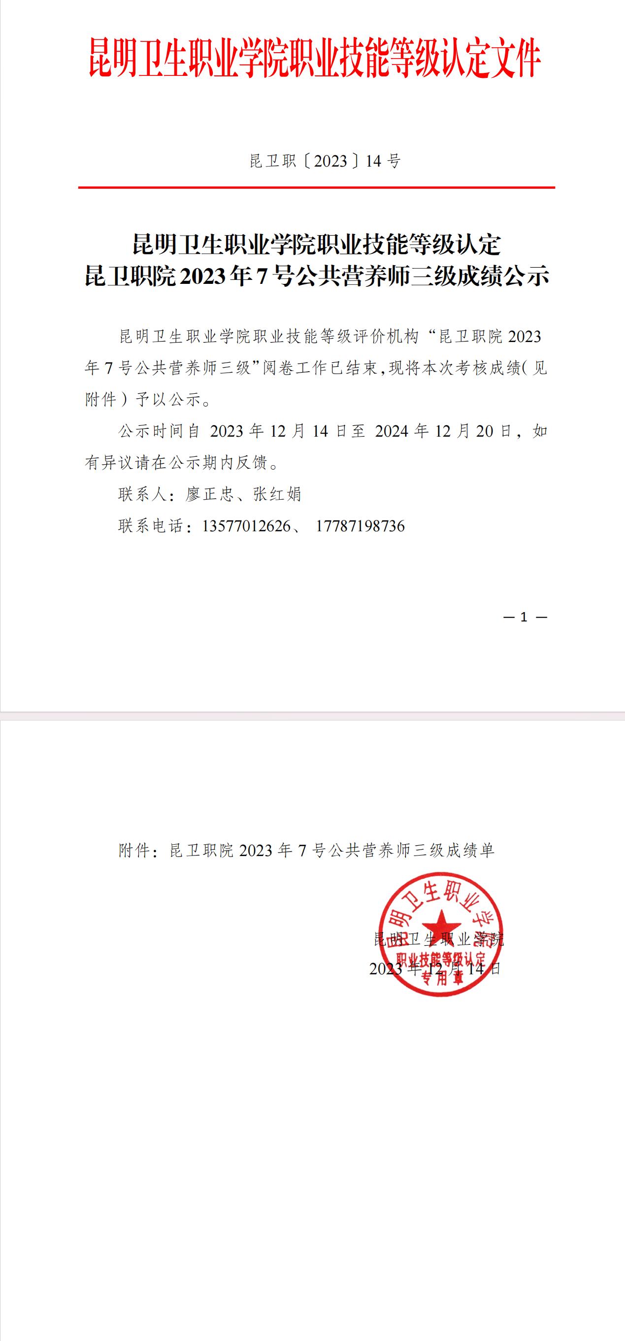 附件昆卫职院2023年7号公共营养师三级成绩单.pdf