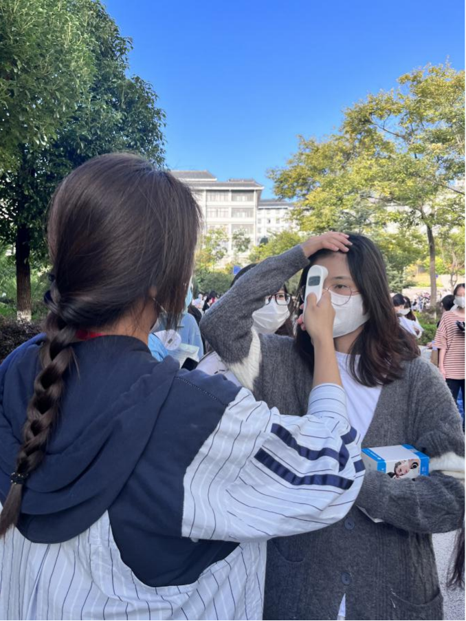 考试当天,考务人员根据疫情防控要求,对考生进行体温测量,检查两码一表,提醒考生务必全程佩戴口罩。