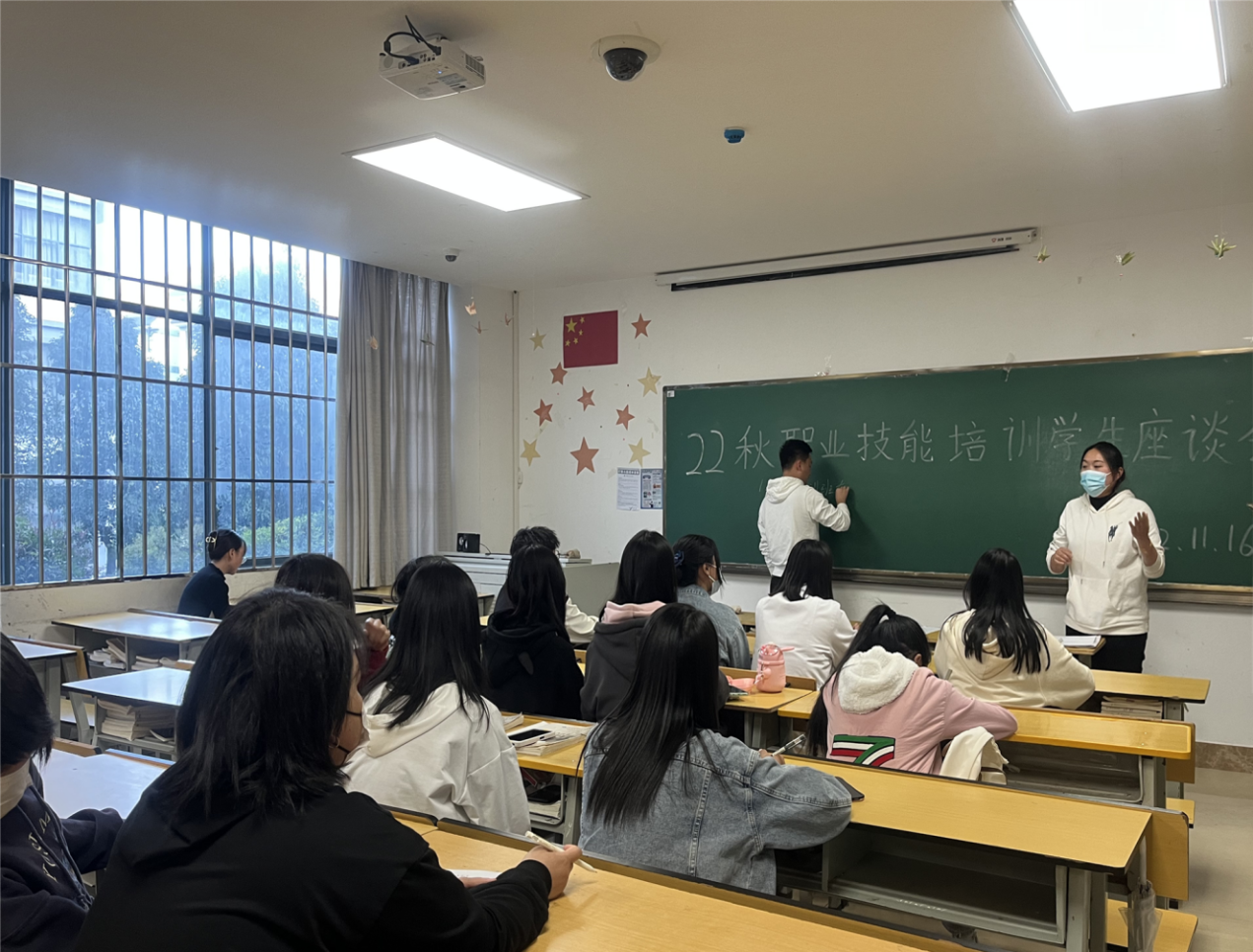继续教育学院秉持着“全心全意为学生服务”的宗旨,为服务好学生,提升教育教学质量,狠抓落实培训教学及学生管理,及时全面的了解学生对培训课程教学、管理等方面的反馈和建议。2022年11月16日18时在继续教育学院102室召开了2022秋季学期职业技能培训班级学生座谈会。继续教育学院李丞浩老师,张媛老师、龙锦老师、覃丹老师,以及各培训班级学生代表参加了此次座谈会。会议由李丞浩老师主持。