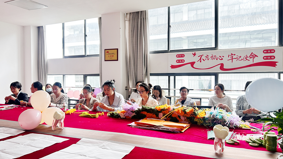 随后,教师们三五成群、巧手翻飞,参照示范或自由创意,不一会儿,已是一片“花海”,淡粉、浅紫、雾霾等,平日拿探针、口镜的手,此刻捻起扭扭棒同样精准而温柔。