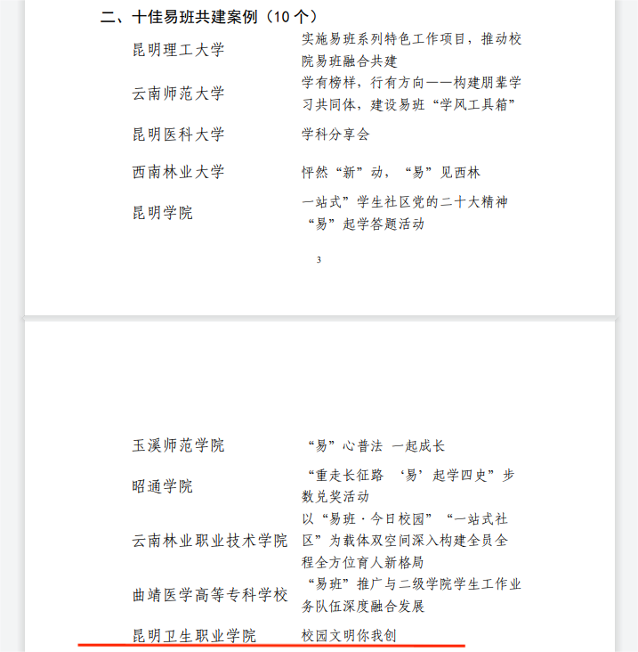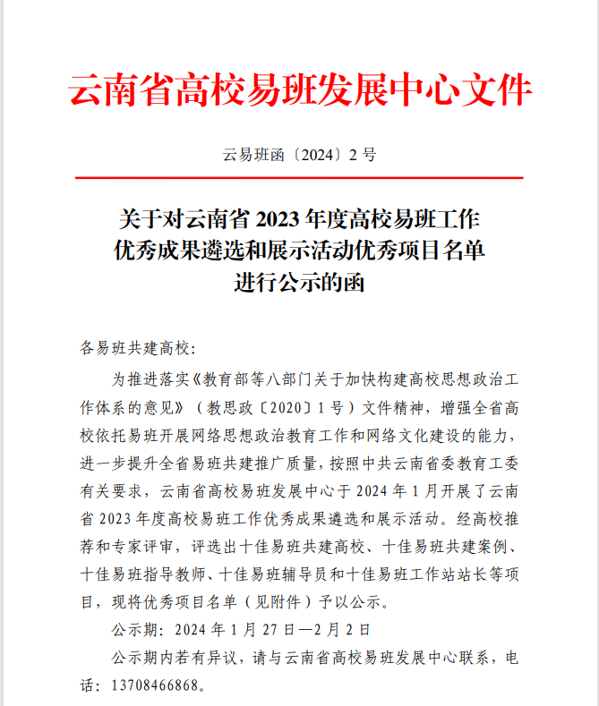 经云南省教育工委和云南省高校易班发展中心公布云南省 2023 年度高校易班工作优秀成果遴选和展示活动优秀项目名单。350vip浦京集团官网易班工作发展中心继续推进落实《教育部等八部门关于加快构建高校思想政治工作体系的意见》文件精神,依托易班平台,不断提升浦京网络思想政治教育工作。按照云南易班工作发展中心易班建设评选要求,浦京上报共三项参评项目,其中“十佳易班共建案例——校园文明你我创”、“十佳易班工作站站长”荣获2023年度云南省高校易班工作优秀项目。