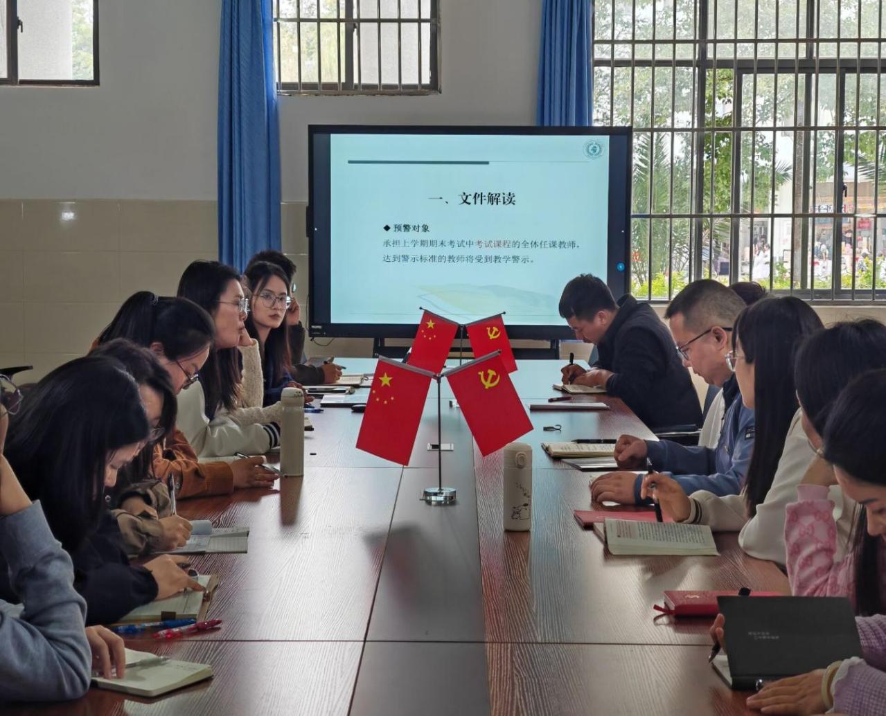 首先,教学办严丽老师反馈浦京教师在上一学年期末考试工作中出现的警示情况,严老师针对浦京教师存在的问题进一步分析原因并提出对策。紧接着,严老师带领全体教师再次学习了《浦京〔2023〕245号 关于开展2023-2024学年第一学期教学警示工作的通知》,进一步加深浦京教师对预警对象,警示标准、流程及说明等内容的了解,为下一学年更好地开展教学工作,提升教育教学质量提供指导。