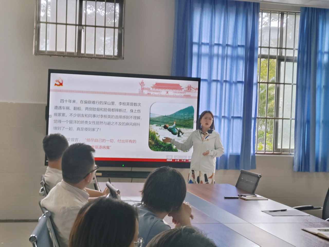 马克思主义党支部宣传委员李易繁围绕时代楷模李恒英展开宣讲,主要讲述了李恒英医生的个人经历及百年来抗击麻风病的艰辛历程。李桓英同志是医者仁心的世界级麻风病防治专家,是新时代医务工作者的优秀代表、践行科学家精神的杰出典范、爱国归侨的学习榜样。