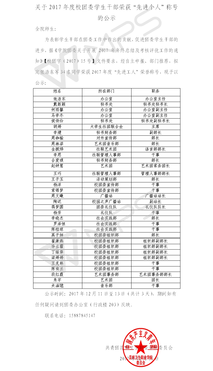 关于2017年度校团委学生干部荣获“先进个人”称号的公示
