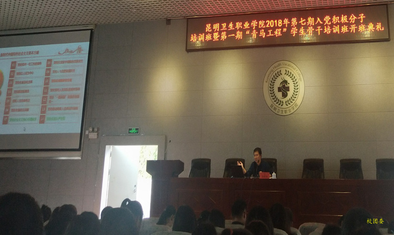 为认真贯彻落实党的十九大、十九届二中、三中全会和习近平新时代中国特色社会主义思想精神,进一步发挥大学生骨干的示范引领作用,学院党委和团委联合举办了第七期入党积极分子暨“青马工程”培训班,参加培训的学员有2018年的入党积极分子和团委学生骨干共计225名师生。培训班开班典礼于2018年4月18日下午在学生报告厅举行,学院党委副书记张晓刚同志,党委委员、宣传统战部部长王斌通知,团委书记雷红梅同志以及学院各党支部书记、委员等领导共同出席了开班典礼,典礼由团委宣传委员董敏同志主持。