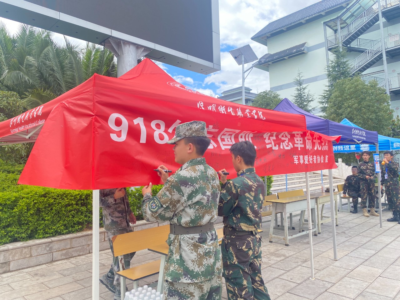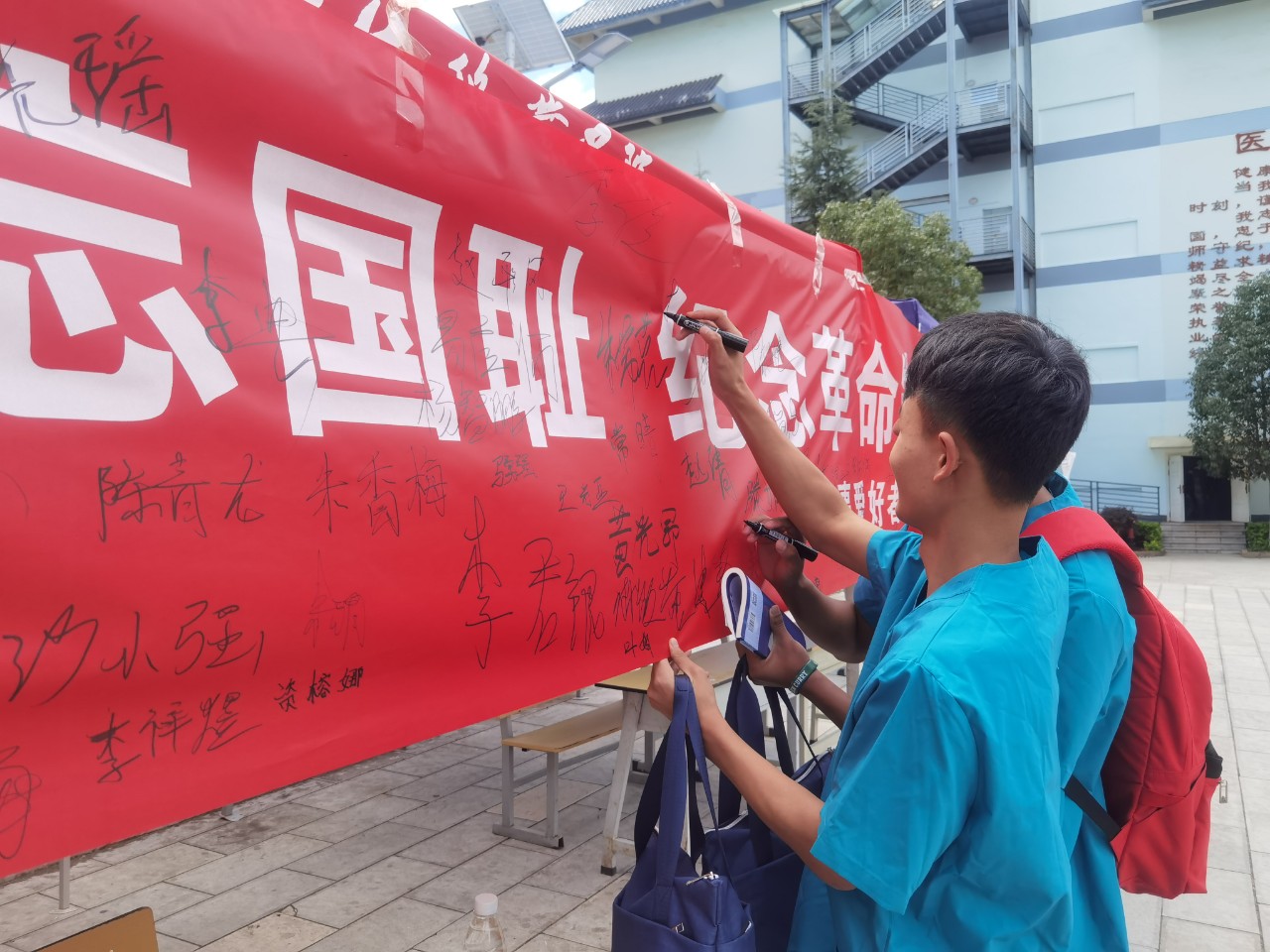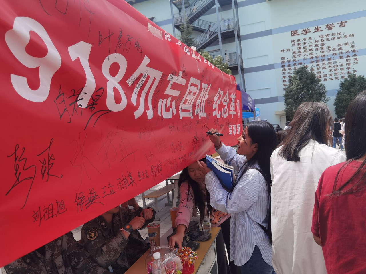 随后,数百支刻有“缅怀先烈,不忘国耻,铭记九一八”印记的签字笔有秩序地发放在广大师生的手中作“九一八”纪念笔。大家积极踊跃,数支签字笔不停地在横幅上舞动,在横幅上庄严地签上了自己的姓名。每一个姓名不仅仅有着对祖国的美好祝愿,更有同学们的励志:“九一八纪念日,警钟长鸣,勿忘国耻,努力奋斗,保卫中华!”。