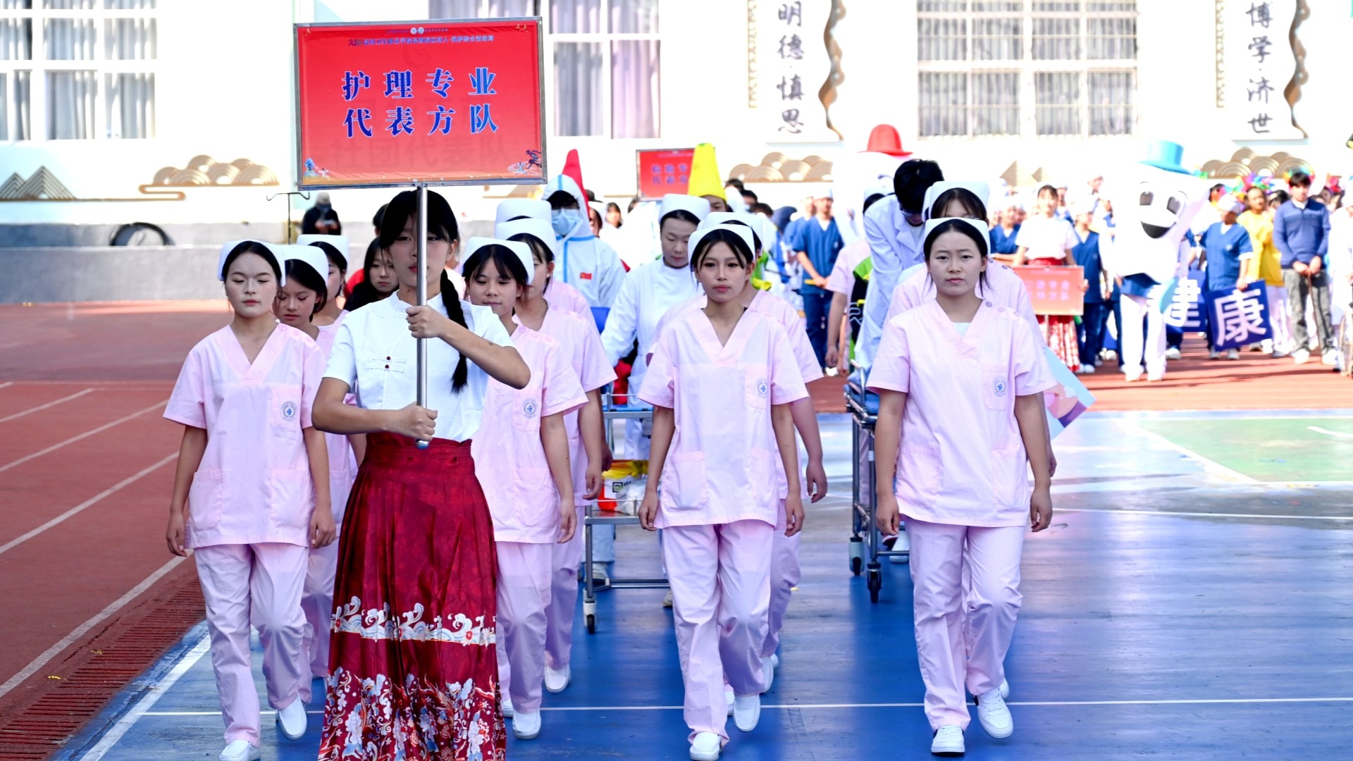 药学专业方队率先登场,铿锵步伐中携中西医智慧而来;护理专业方队紧随其后,专业底气十足;检验专业方队步履铿锵、目光坚定,尽显“临床诊断火眼金睛”的严谨;口腔专业方队如朝阳般活力四射,传递“口腔健康,全民健康”的核心理念;康复专业方队带着首次参赛便斩获省赛二等奖的荣光而来。
