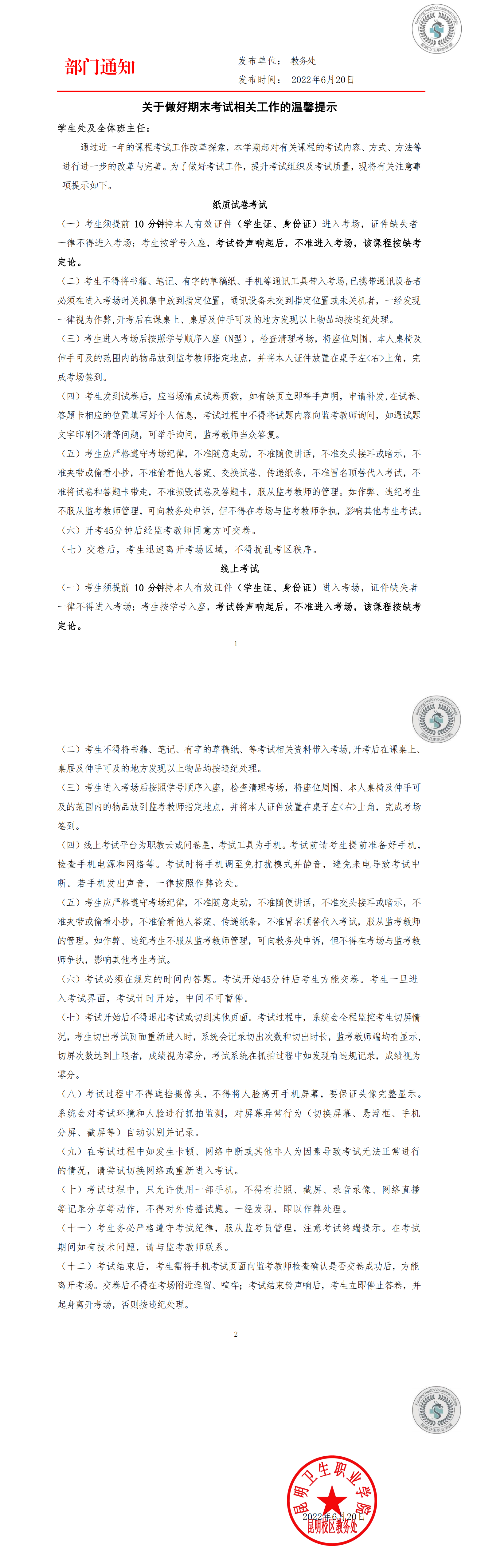 关于做好期末考试相关工作的温馨提示
