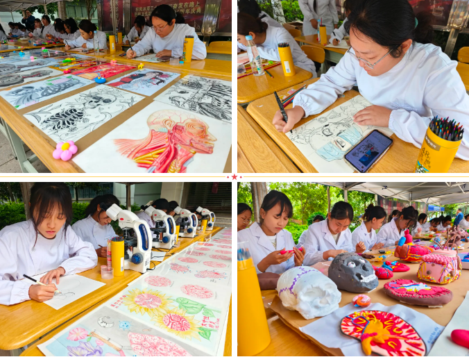 庆典仪式结束后,与会嘉宾走进学院各专业实训室,开启了一场内容丰富的“沉浸式探校”活动。在基础医学院实训楼前的小广场,各专业学生现场展开“艺术创作”:或手绘解剖图、显微镜下的破伤风梭菌、霍乱孤菌等,或以粘土制作人体器官,手法娴熟、细节精准、栩栩如生,展现出同学们对医学专业的深深热爱。