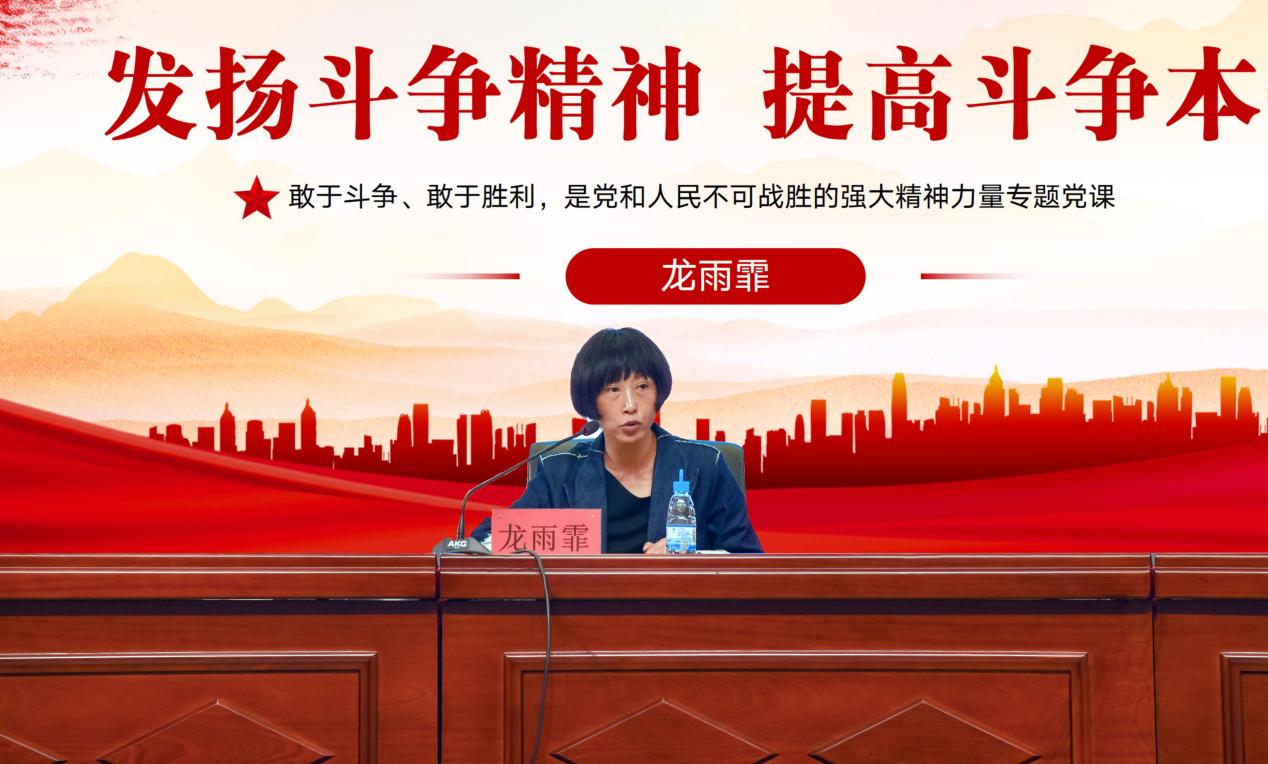 龙雨霏向学校全体党员干部讲授了新时代弘扬斗争精神的理论基础和新时代伟大斗争的提出过程的内容。从这两个方面引导广大党员在加强理论水平、夯实理论功底中发扬斗争精神;在加强信仰追求、践行初心使命中发扬斗争精神;在增强忧患意识、敢于担当中发扬斗争精神;在深入调查研究、加强艰苦奋斗中发扬斗争精神;在顺应历史发展、汲取历史经验中发扬斗争精神;在把握斗争策略、提高斗争的效率中发扬斗争精神。