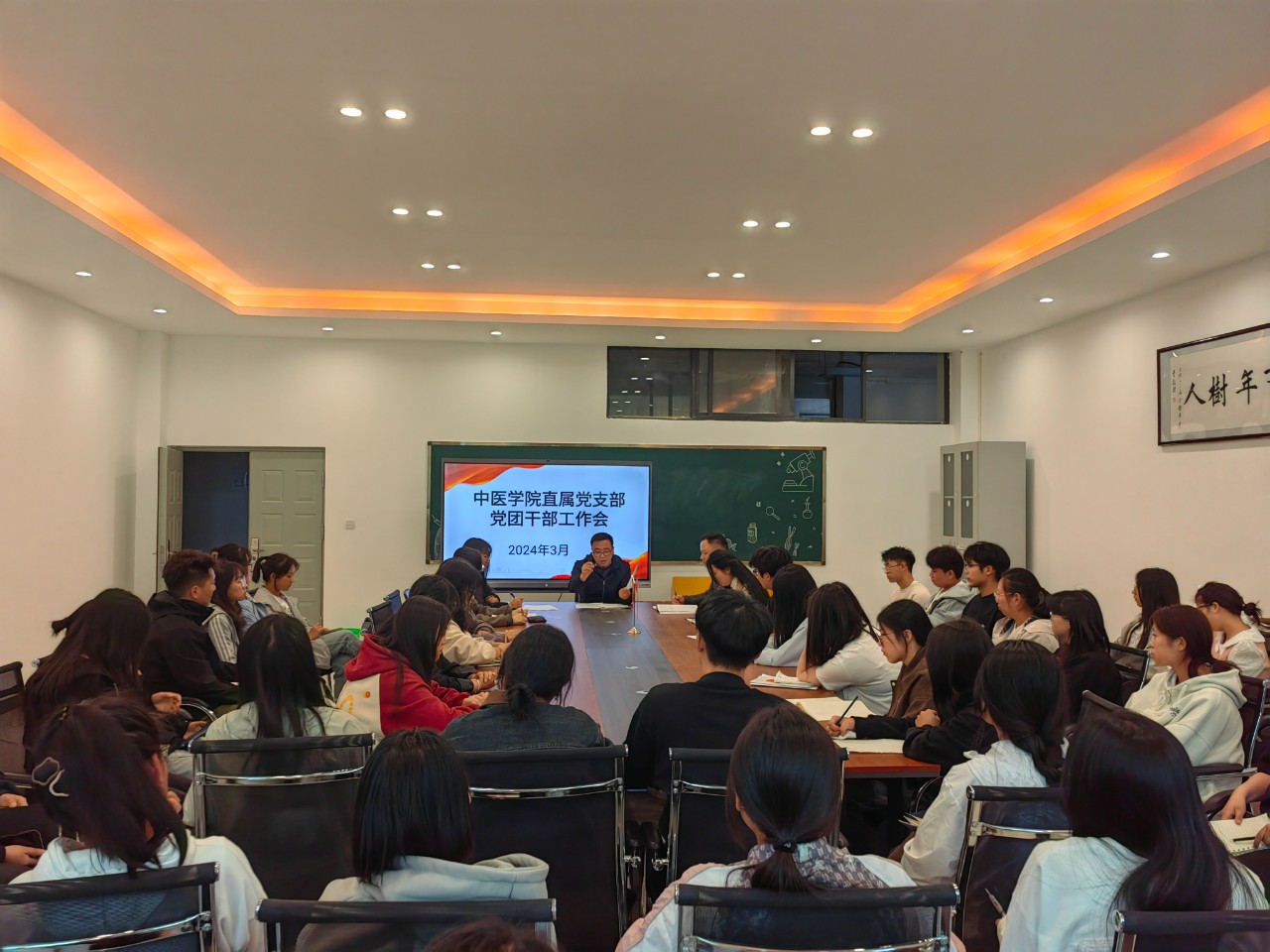 为进一步加强党支部的组织建设,提升党团干部的综合素质和执行力,为党的各项工作提供有力保障。中医学院直属党支部于2024年3月18日晚召开党团工作会议,本次会议的主要目的是总结近期党支部的工作情况,分析存在的问题和不足,研究部署下一阶段的工作计划。会议由中医学院直属党支部书记易斯坐同志主持,中医学院入党申请人及各班团支部书记参加。