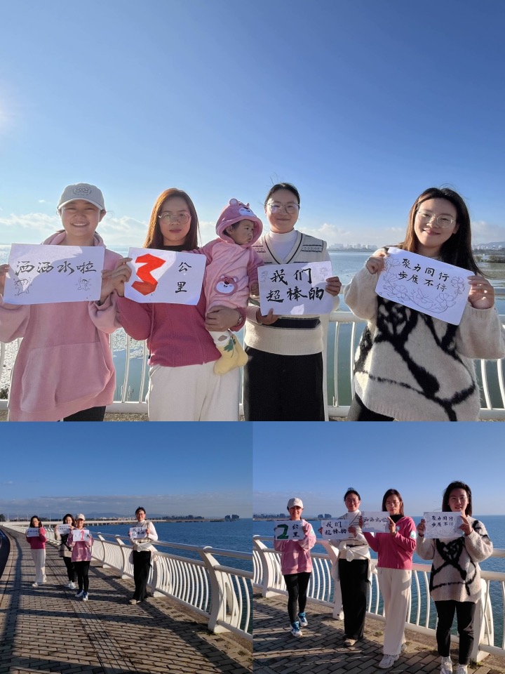 随着工作人员的哨声响起,大家按照预定的路线开始了慢步跑活动,沿途,大家欣赏着美丽的风景,呼吸着新鲜的空气,朝阳温柔地洒在水面上,波光粼粼,一群海鸥在晨光中翩翩起舞,为这宁静的早晨增添了无数生机。慢步跑过程中,大家相互鼓励、共同进步,在每一个关卡点合影留念。为保障活动的安全进行,工作人员密切关注着各位老师的身体状况,在每一个关卡处设置了补给巧克力、矿泉水。